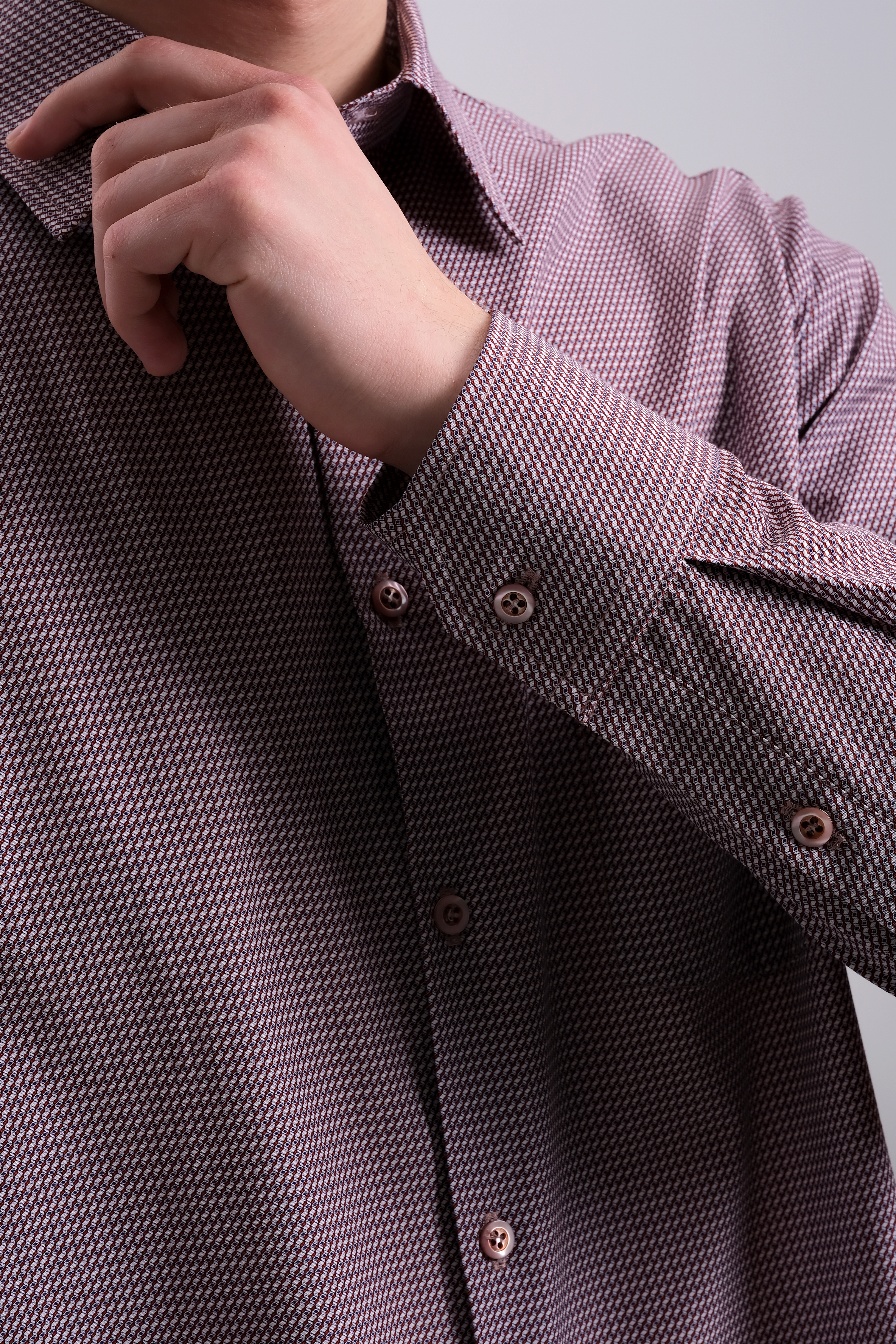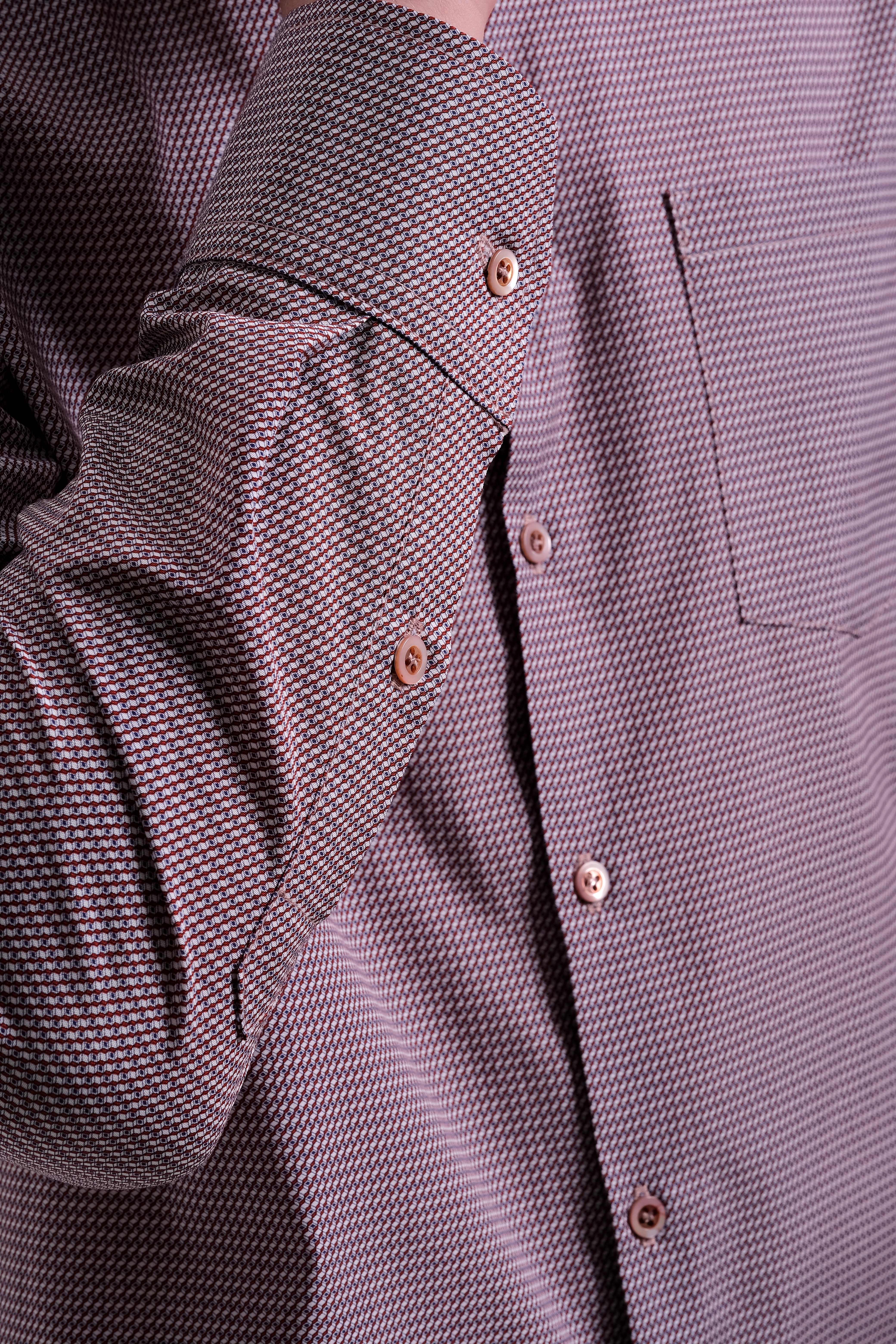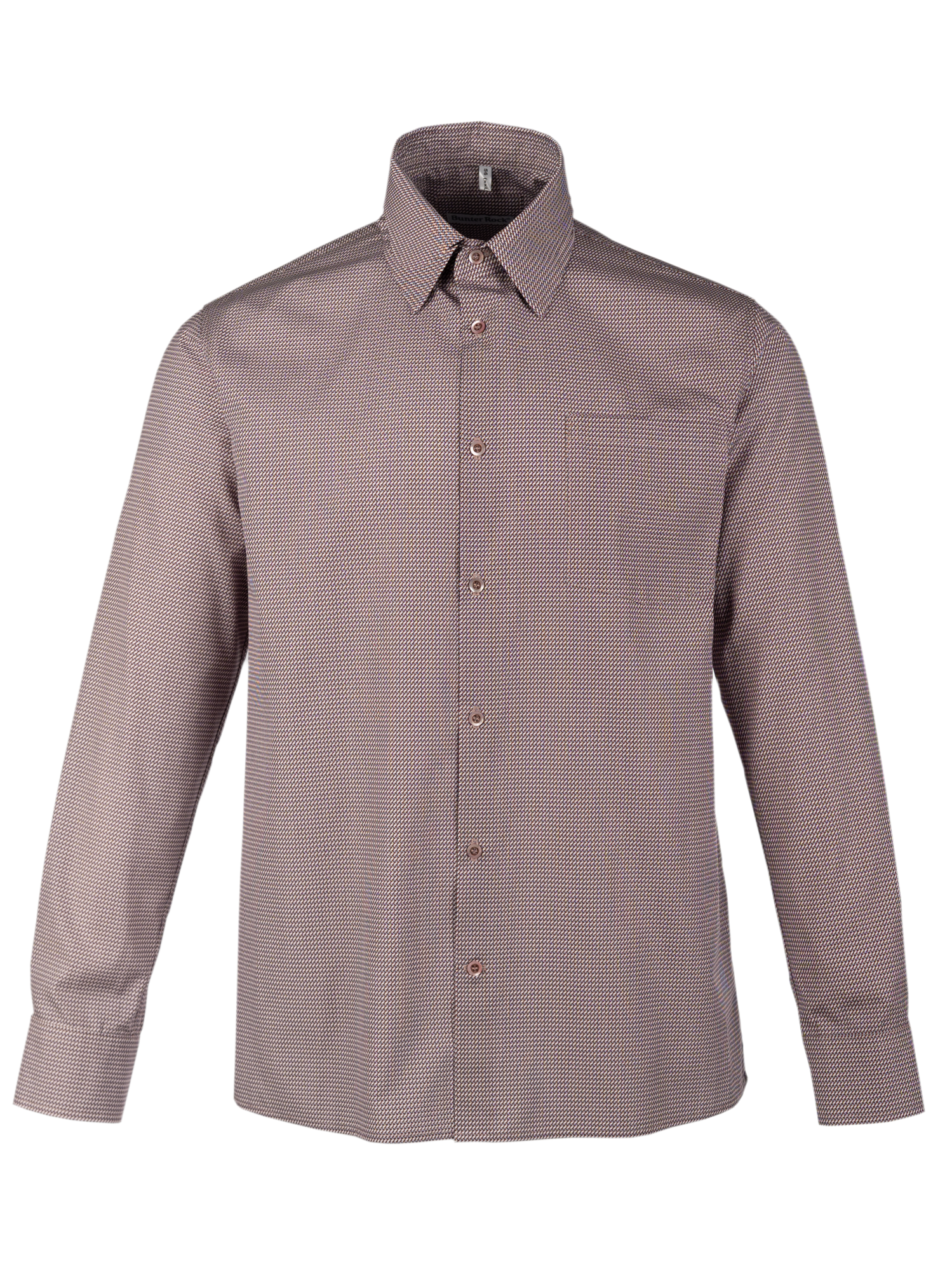 Рубашка из хлопка итальянского производителя, печатный мелкий геометрический принт сине-красно-белого цвета. Воротник на стойке классический, перламутровые пуговицы. Манжеты со скошенным уголком. Ассоциации с принтом: стабильность, достаток. Силуэт полуприлегающий. По спинке заложены выточки, которые дают изделию приталенность. Рубашка подходит для повседневной носки и для торжественных мероприятий.