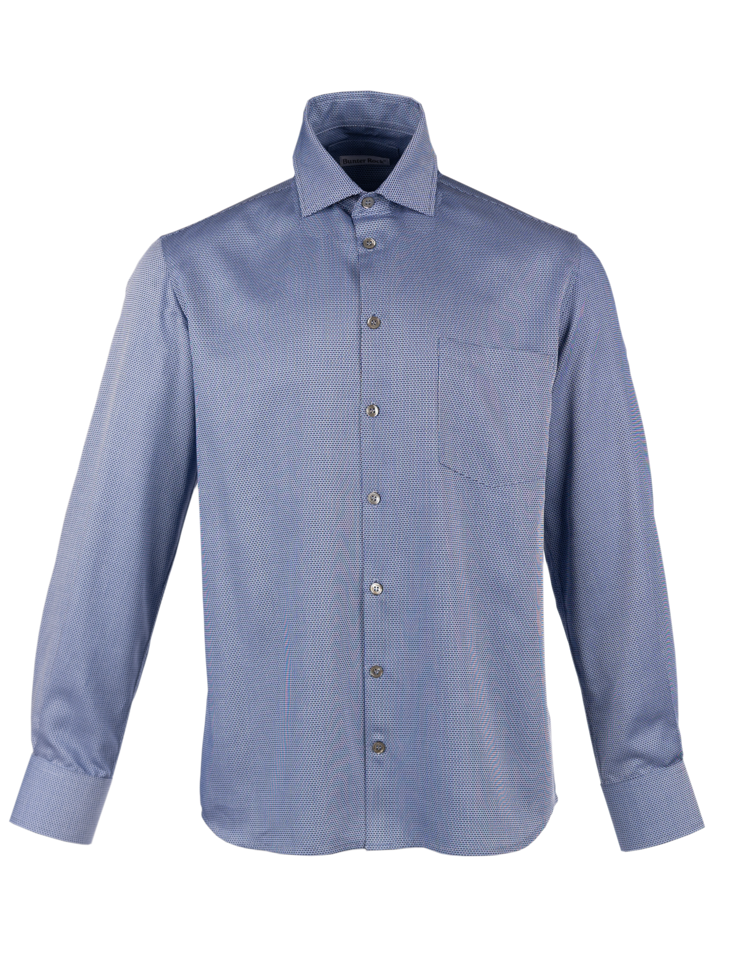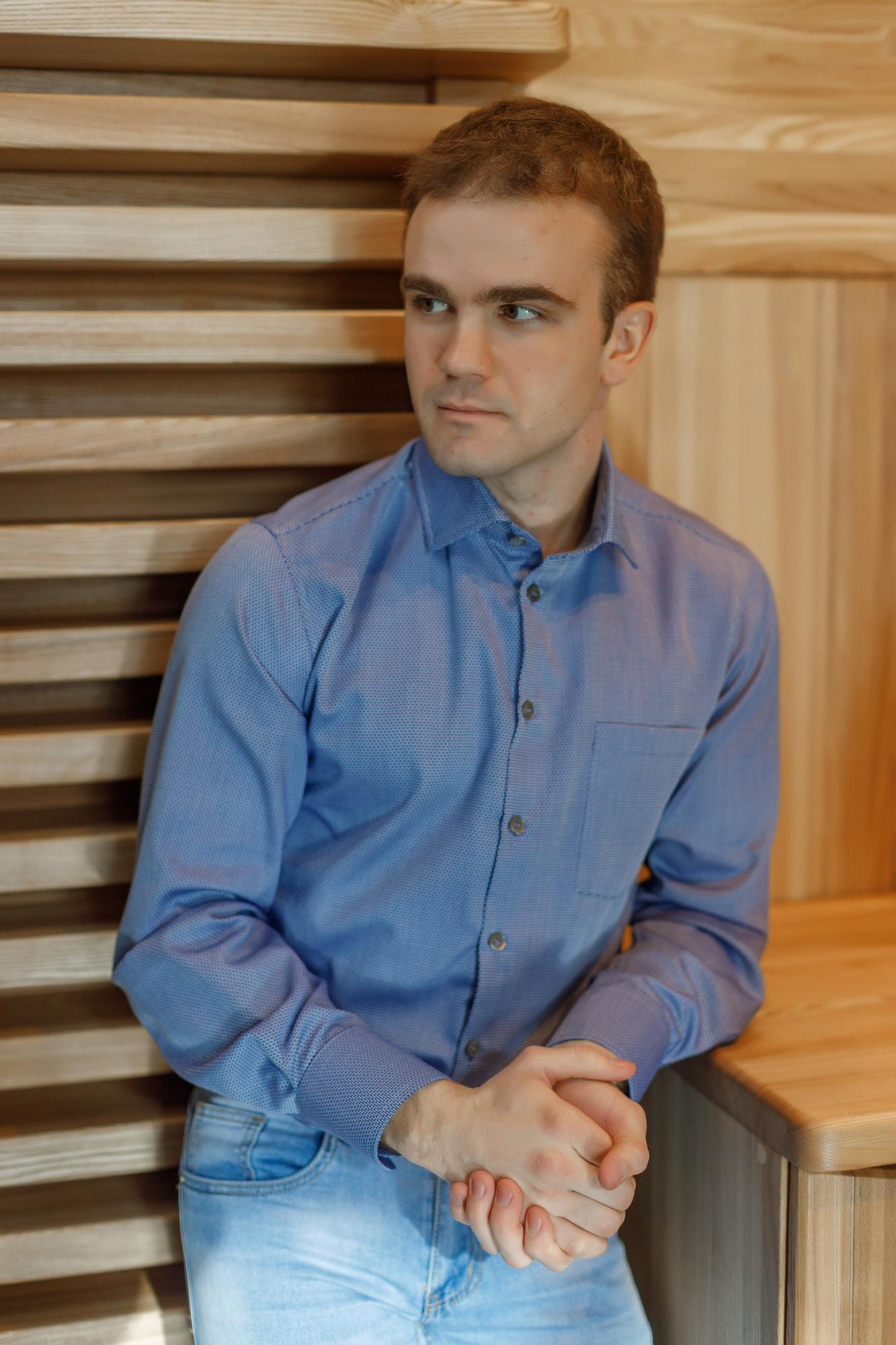 Рубашка из итальянского хлопка жаккардового плетения, мелкий геометрический повторяющийся рисунок в виде звеньев белого,голубого и темено-синего цветов. Воротник на стойке акула, карман на груди слева, пуговицы перламутровые. Края манжетов закруглены. Силуэт полуприлегающий. Красивый и благородный вид. По спинке заложены выточки, которые дают изделию приталенность.
