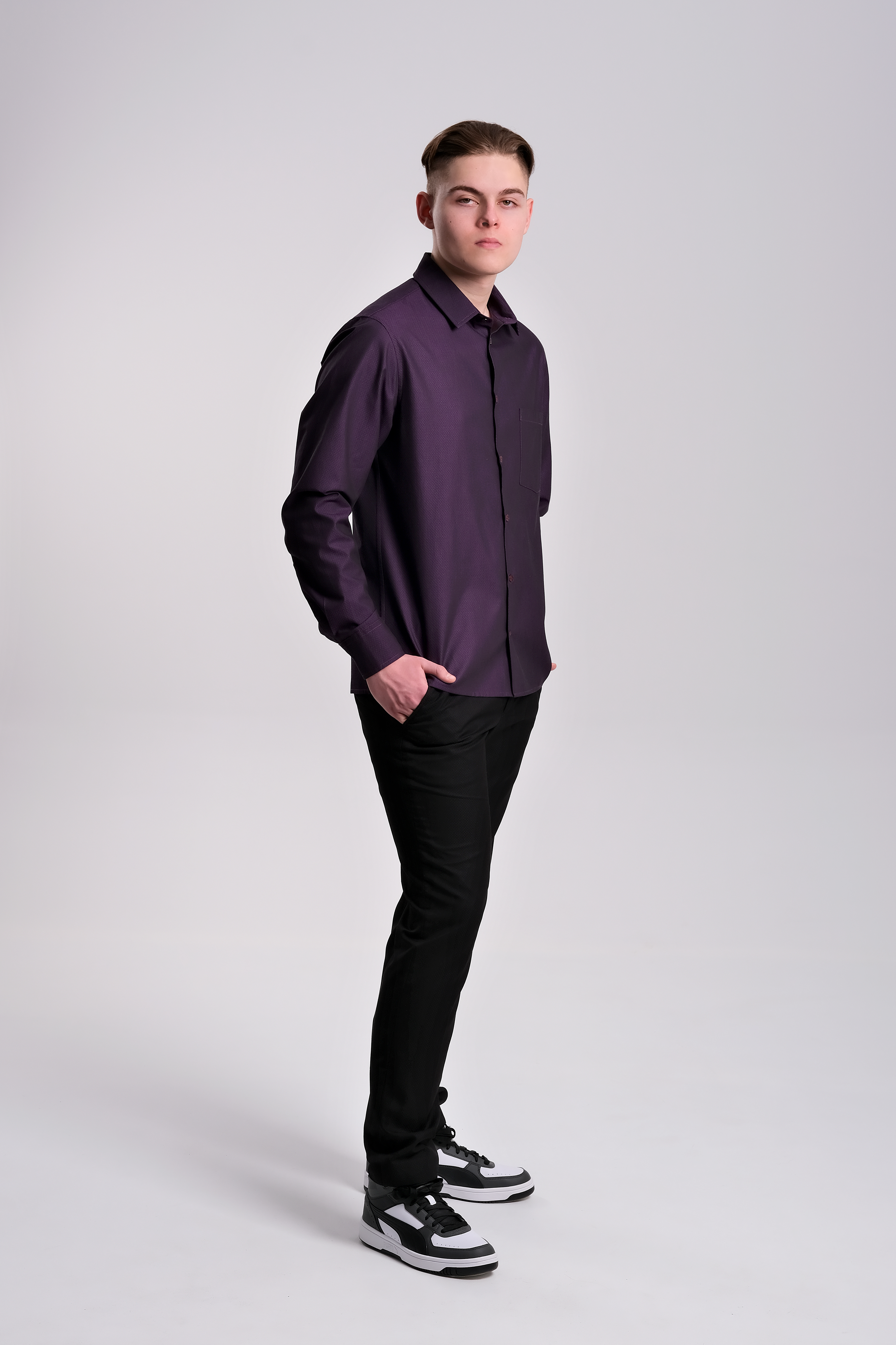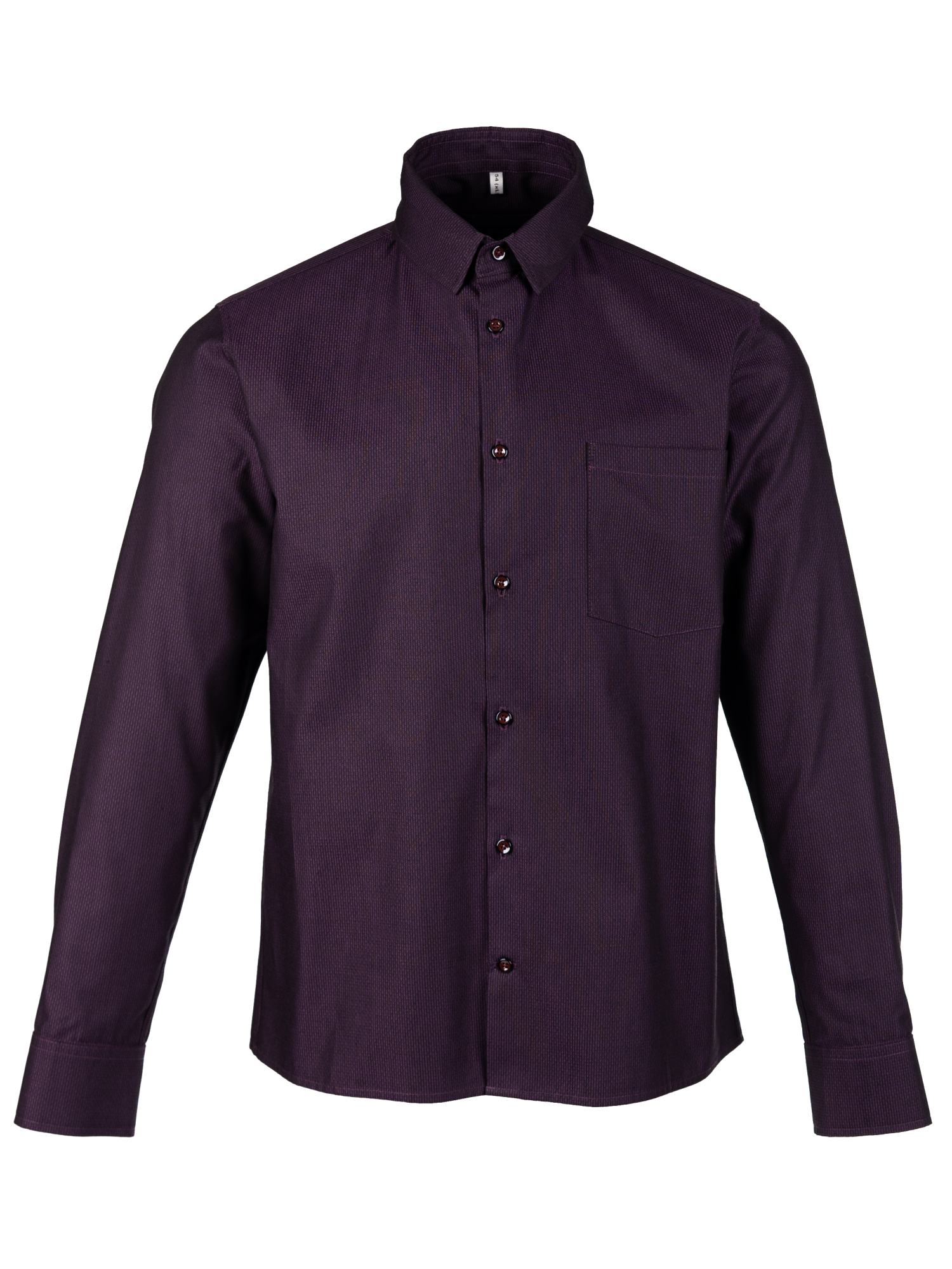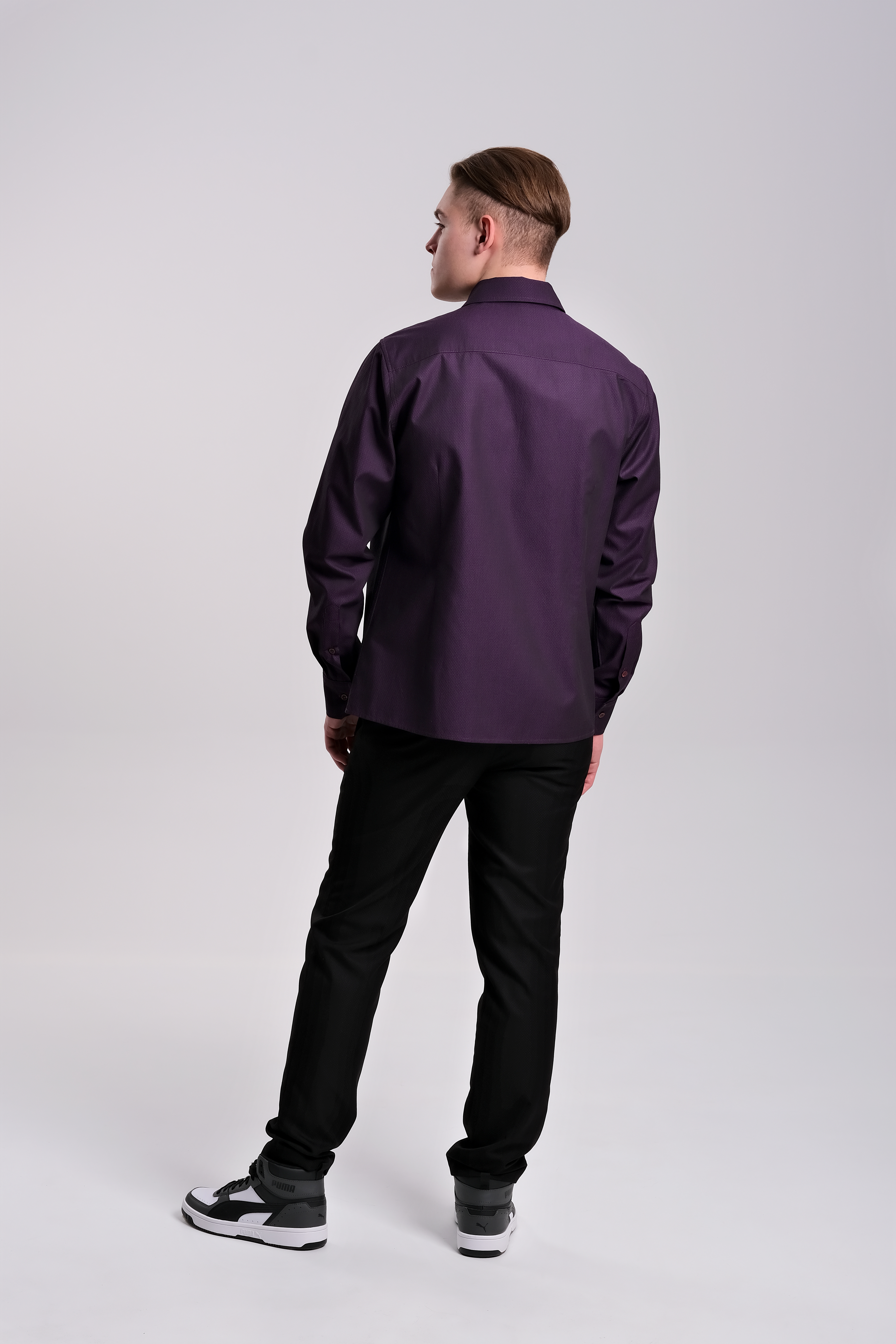 Рубашка из хлопка жаккардового плетения итальянского производителя. Скошенные уголки манжетов. Узкий воротник на стойке. Цвет пурпурный с черным вкраплением, в итоге цвет получается очень вкусным — цвет сладкой ежевики. По спинке заложены выточки, которые дают изделию приталенность. Силуэт полуприлегающий. Рубашка подходит для повседневной носки и для торжественных мероприятий.
