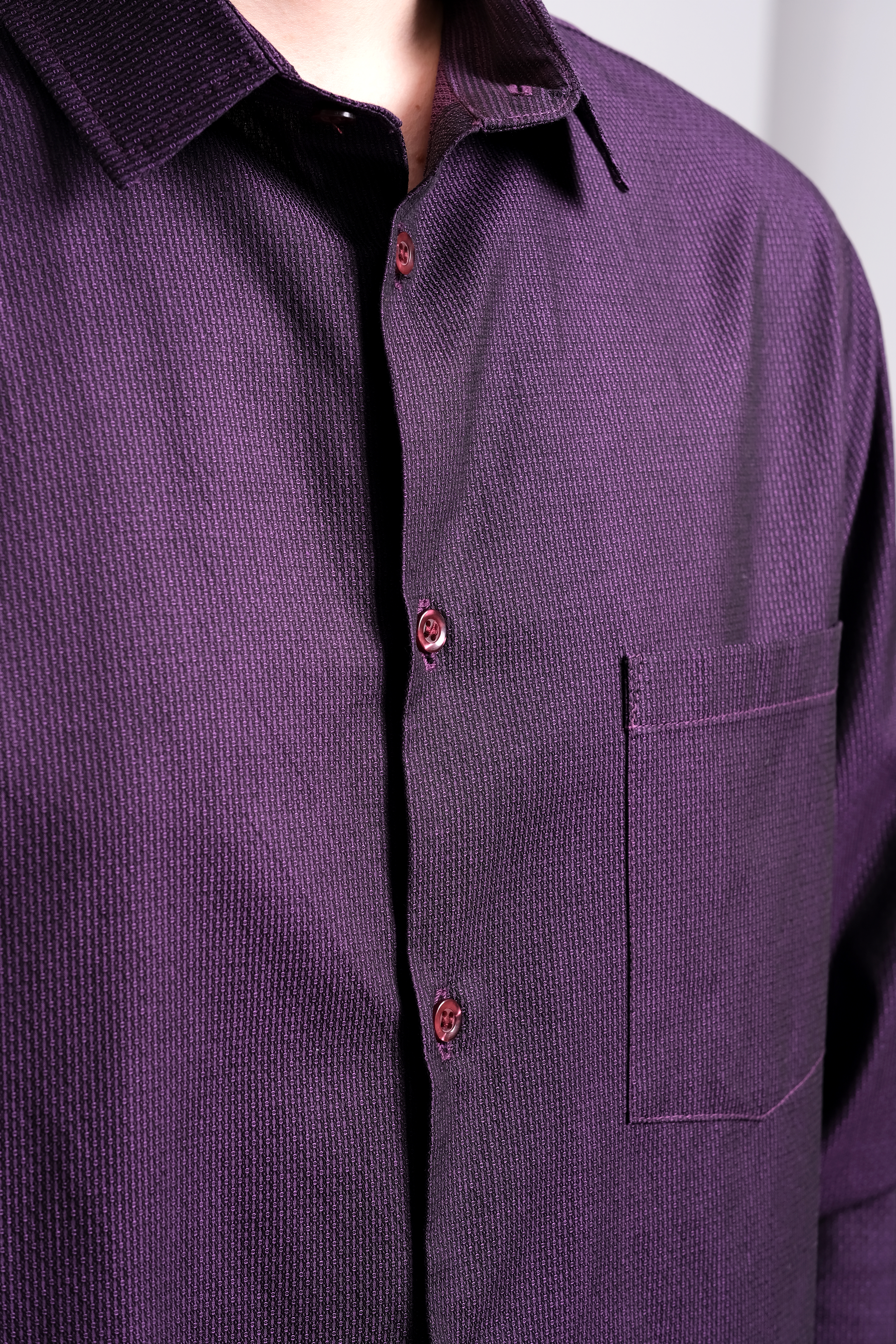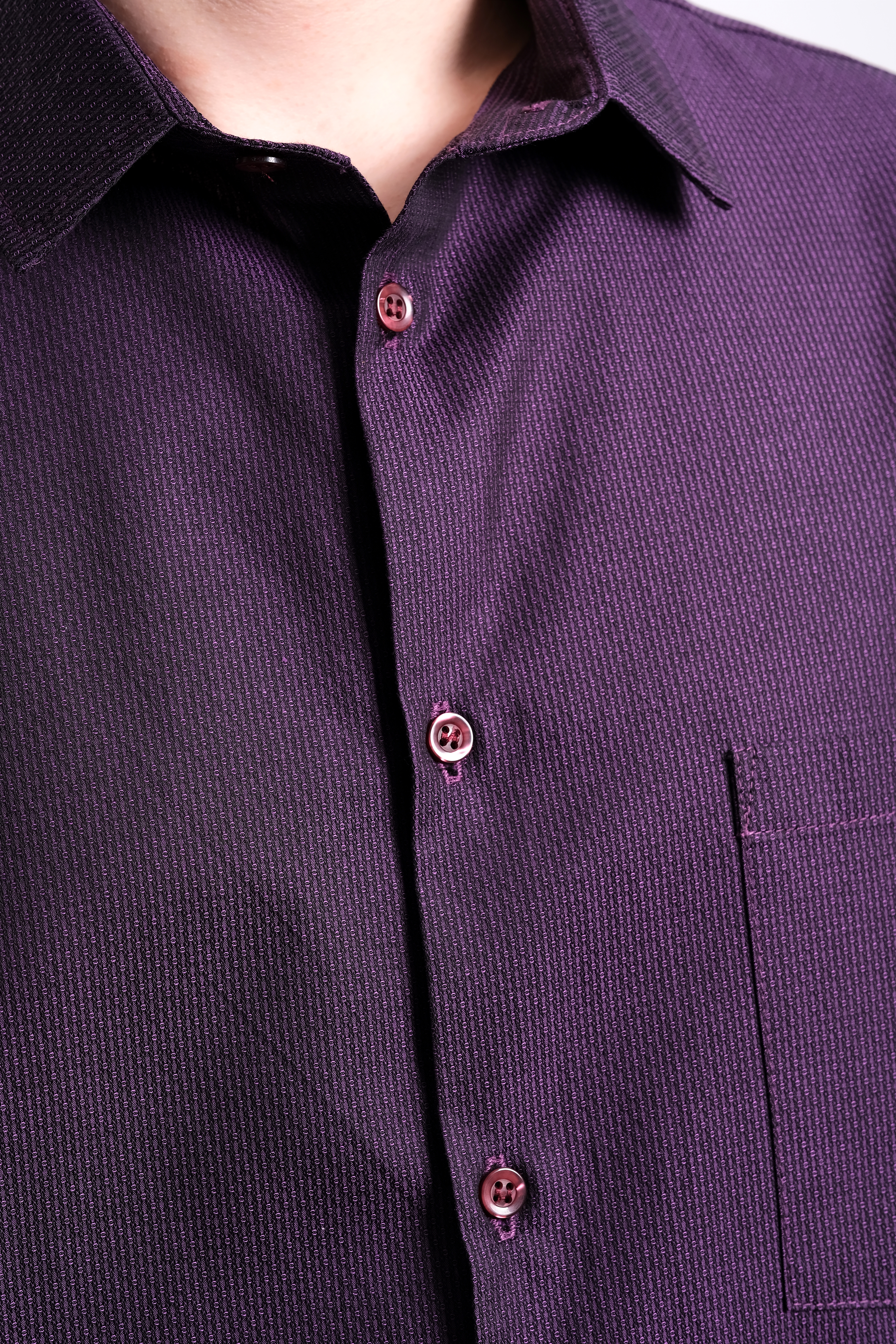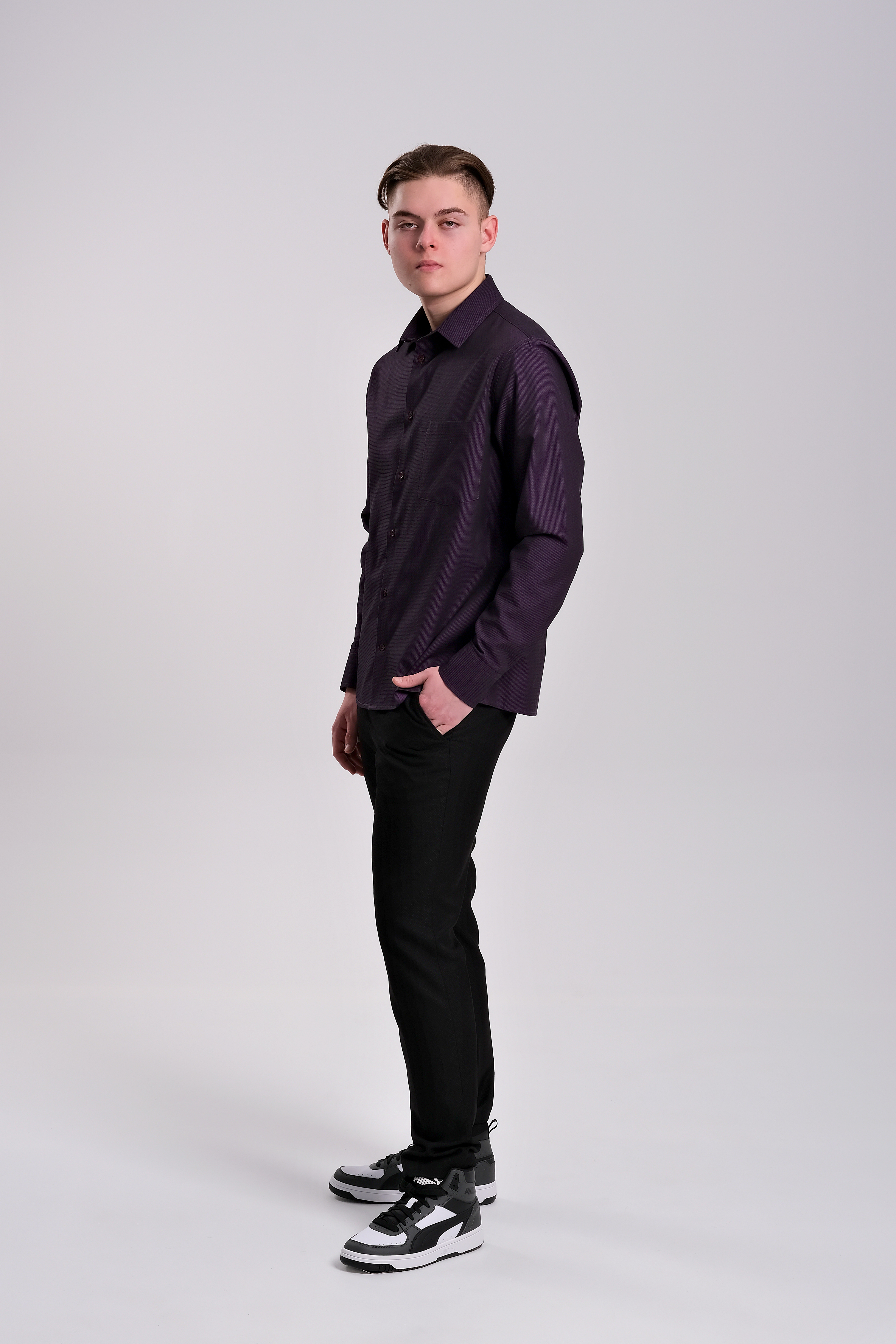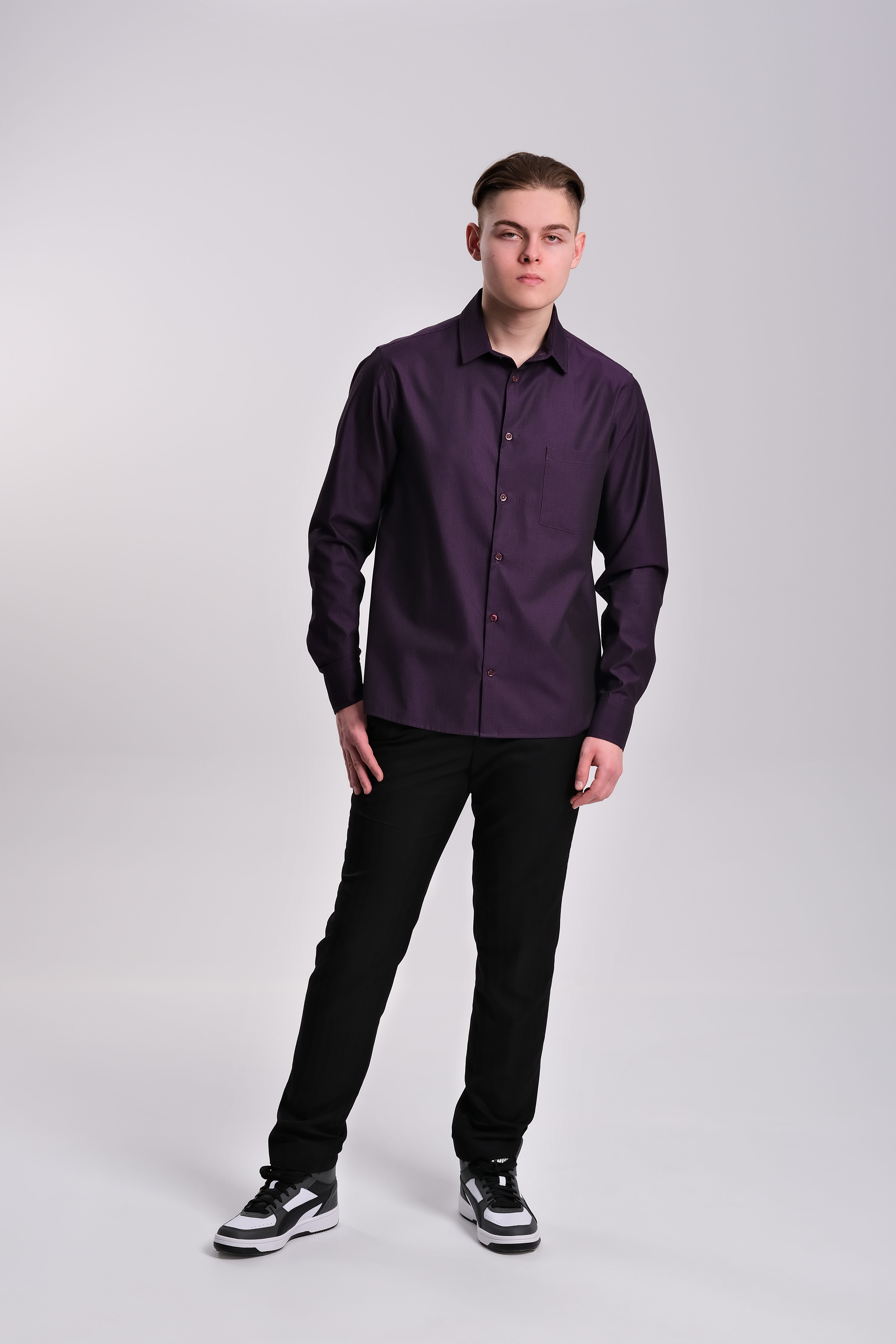 Рубашка из хлопка жаккардового плетения итальянского производителя. Скошенные уголки манжетов. Узкий воротник на стойке. Цвет пурпурный с черным вкраплением, в итоге цвет получается очень вкусным — цвет сладкой ежевики. По спинке заложены выточки, которые дают изделию приталенность. Силуэт полуприлегающий. Рубашка подходит для повседневной носки и для торжественных мероприятий.