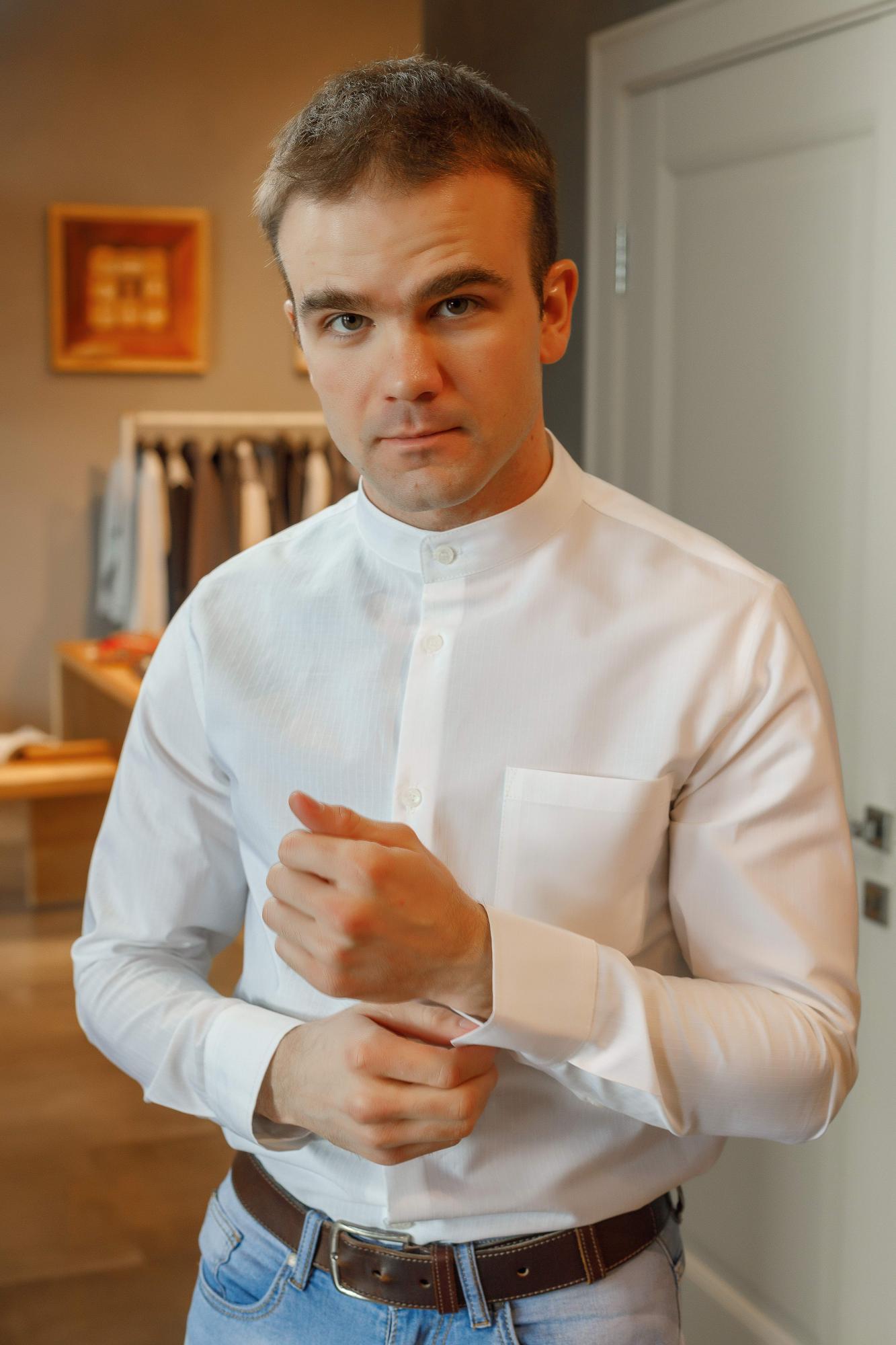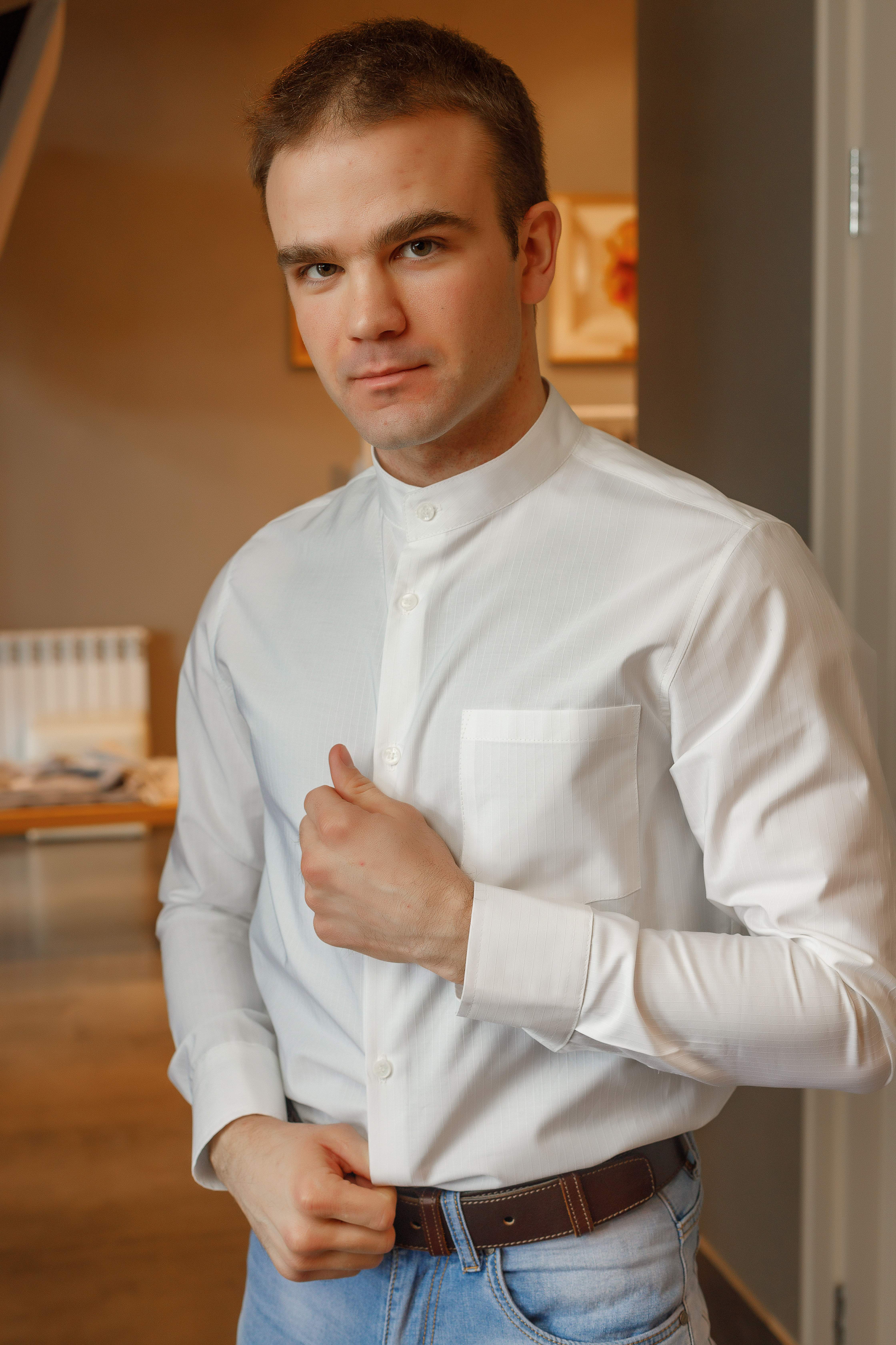 Рубашка из хрустящего хлопка итальянского производителя с выработкой в вертикальную полоску того же цвета, что и данная модель. Воротник стойка, у манжетов скошенные уголки, карман расположен слева на груди. Подходит для повседневной носки как самостоятельный элемент гардероба, так и под костюм. Особенно востребована модель молодыми и дерзкими людьми, потому как тренд на воротник-стойку еще не избитый. Силуэт полуприлегающий. По спинке заложены выточки, которые дают изделию приталенность.