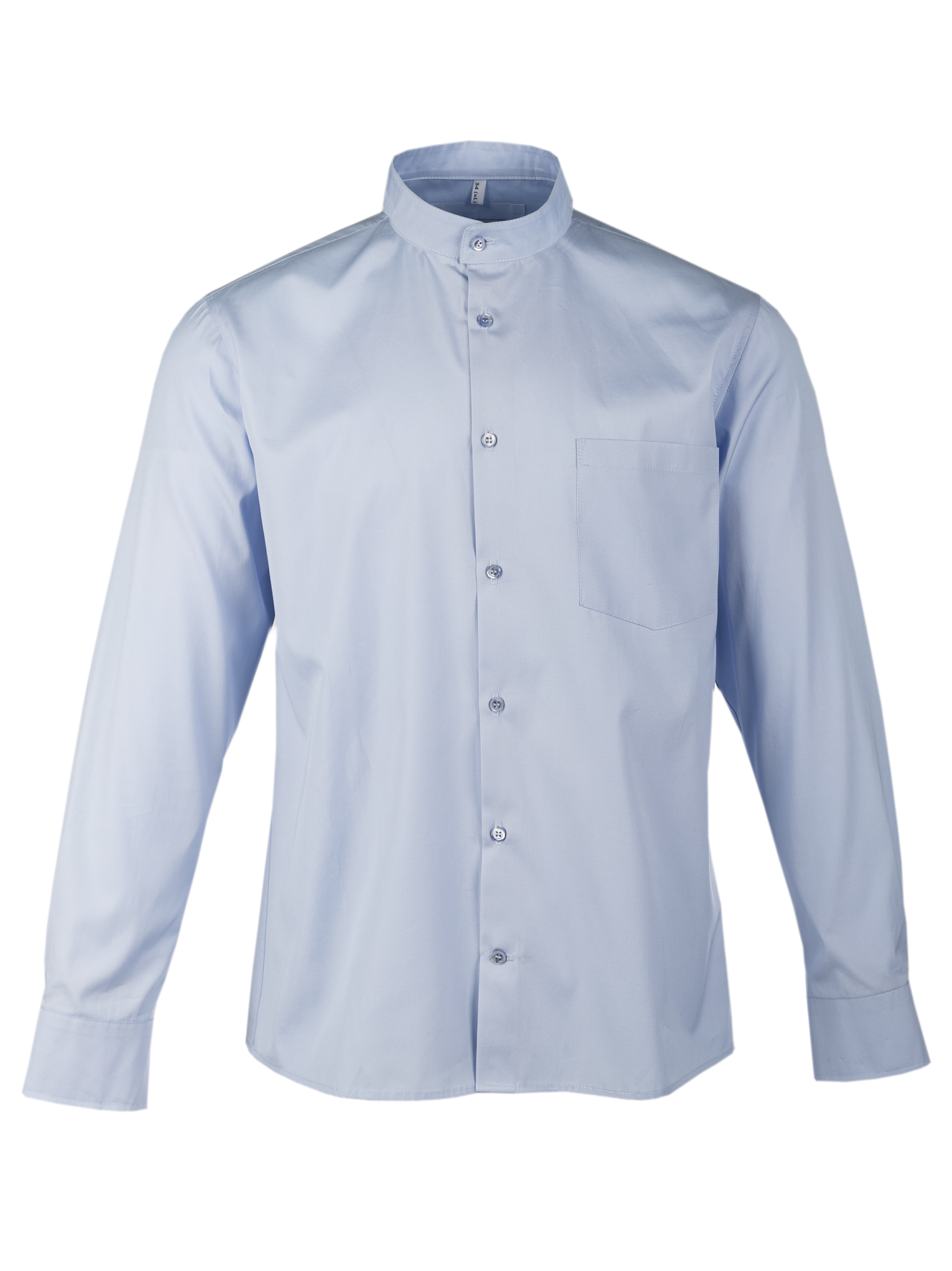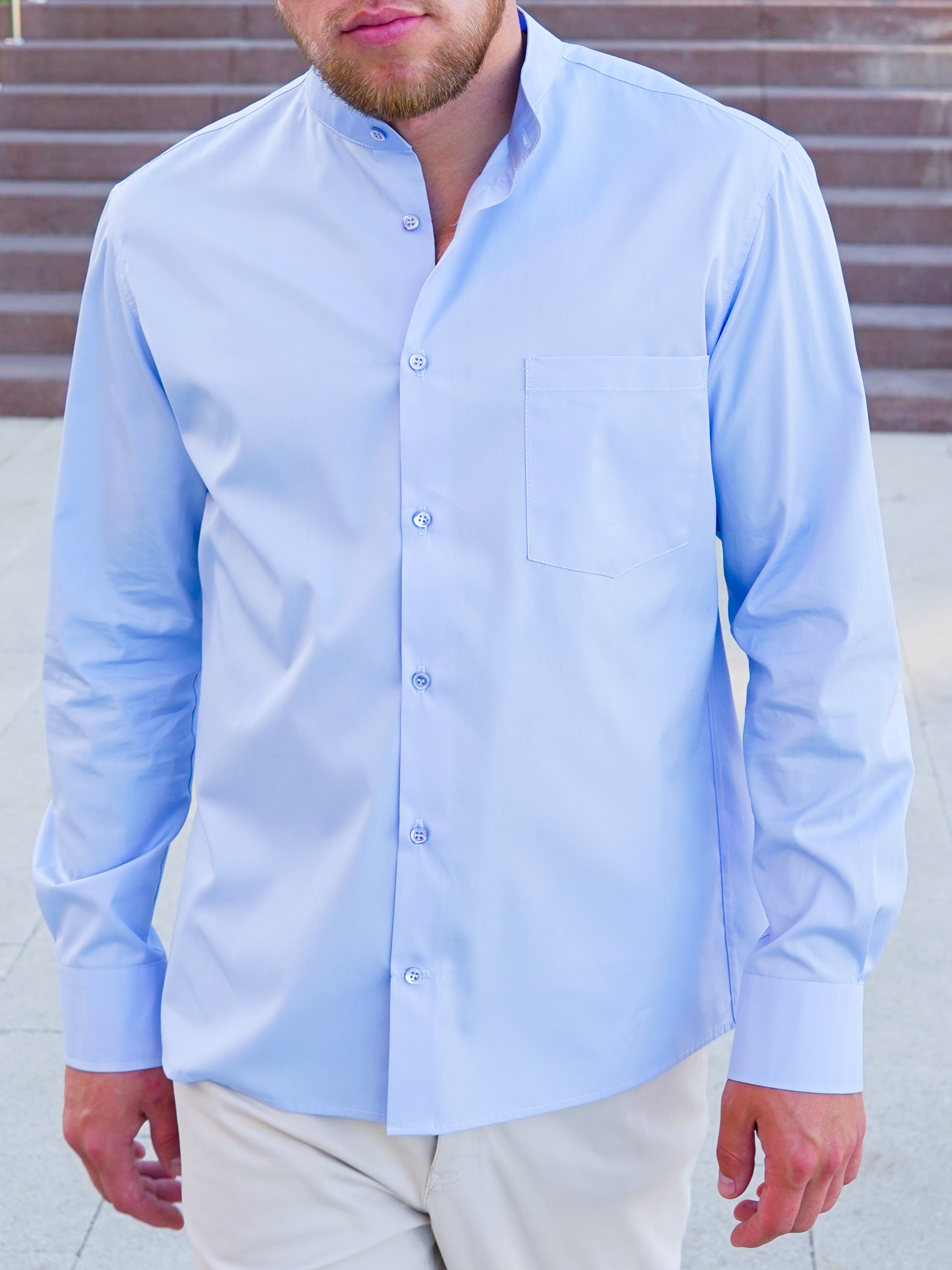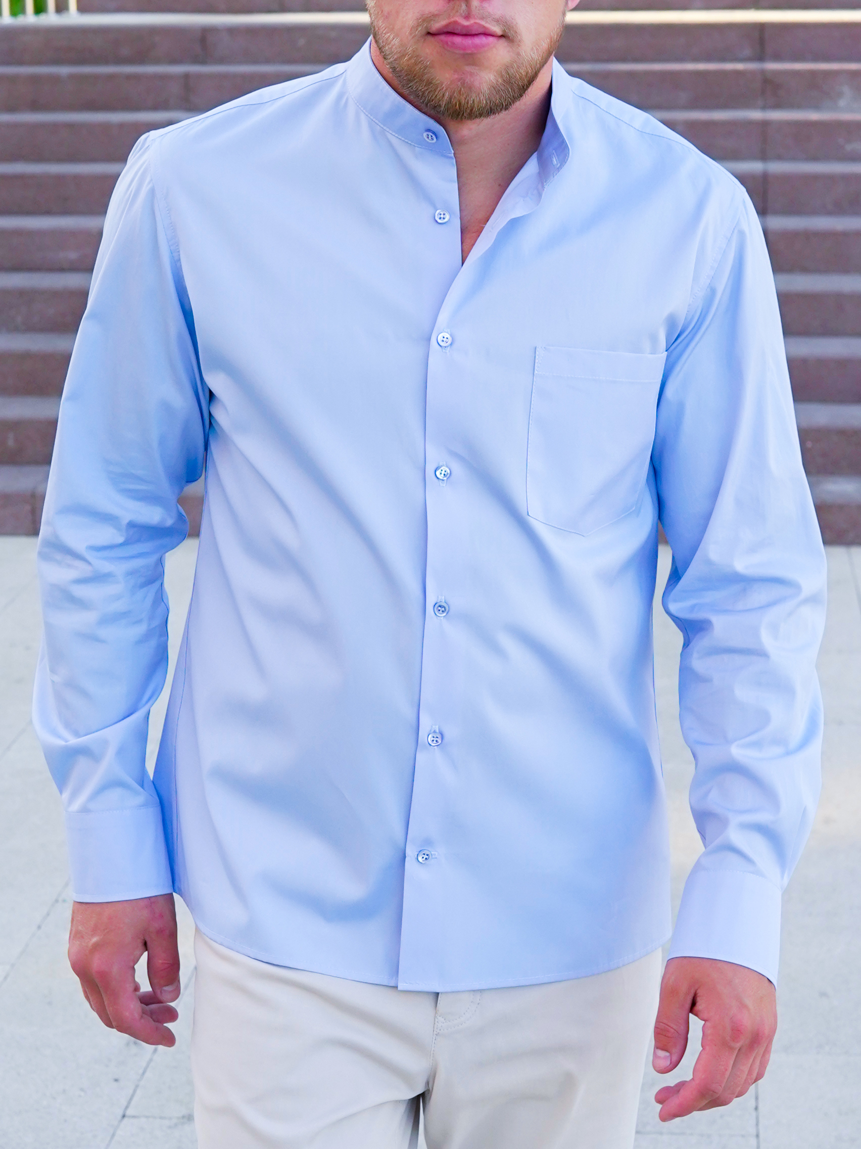 Хрустящий хлопок итальянского производителя нежно-голубого цвета с воротником стойкой. Перламутровые пуговицы, манжеты со скошенными уголками. Карман на груди слева. Подходит для повседневной носки как самостоятельный элемент гардероба, так и под костюм. Особенно востребована модель молодыми и дерзкими людьми, потому как тренд на воротник-стойку еще не избитый. Силуэт полуприлегающий. По спинке заложены выточки, которые дают изделию приталенность.