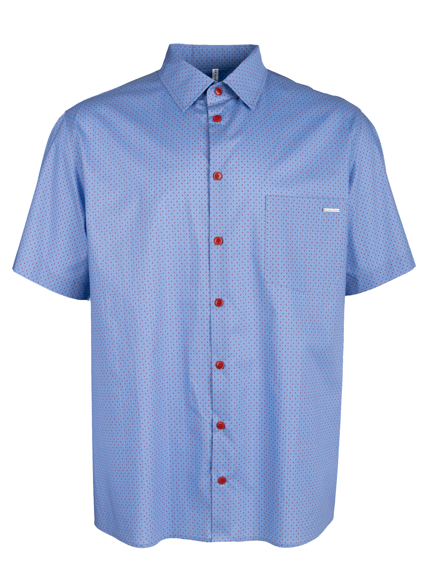 Рубашка из шикарного итальянского хлопка средней плотности, воротник на стойке, форма классическая, карман расположен на груди слева. По спинке заложены выточки, которые дают изделию приталенность. На васильковом фоне расположены насыщенно красные листочки-птички, принт мелкий. Красные пуговицы добавляют обраху оригинальности и яркости. Подходит для повседневной носки на отдыхе и в городе.