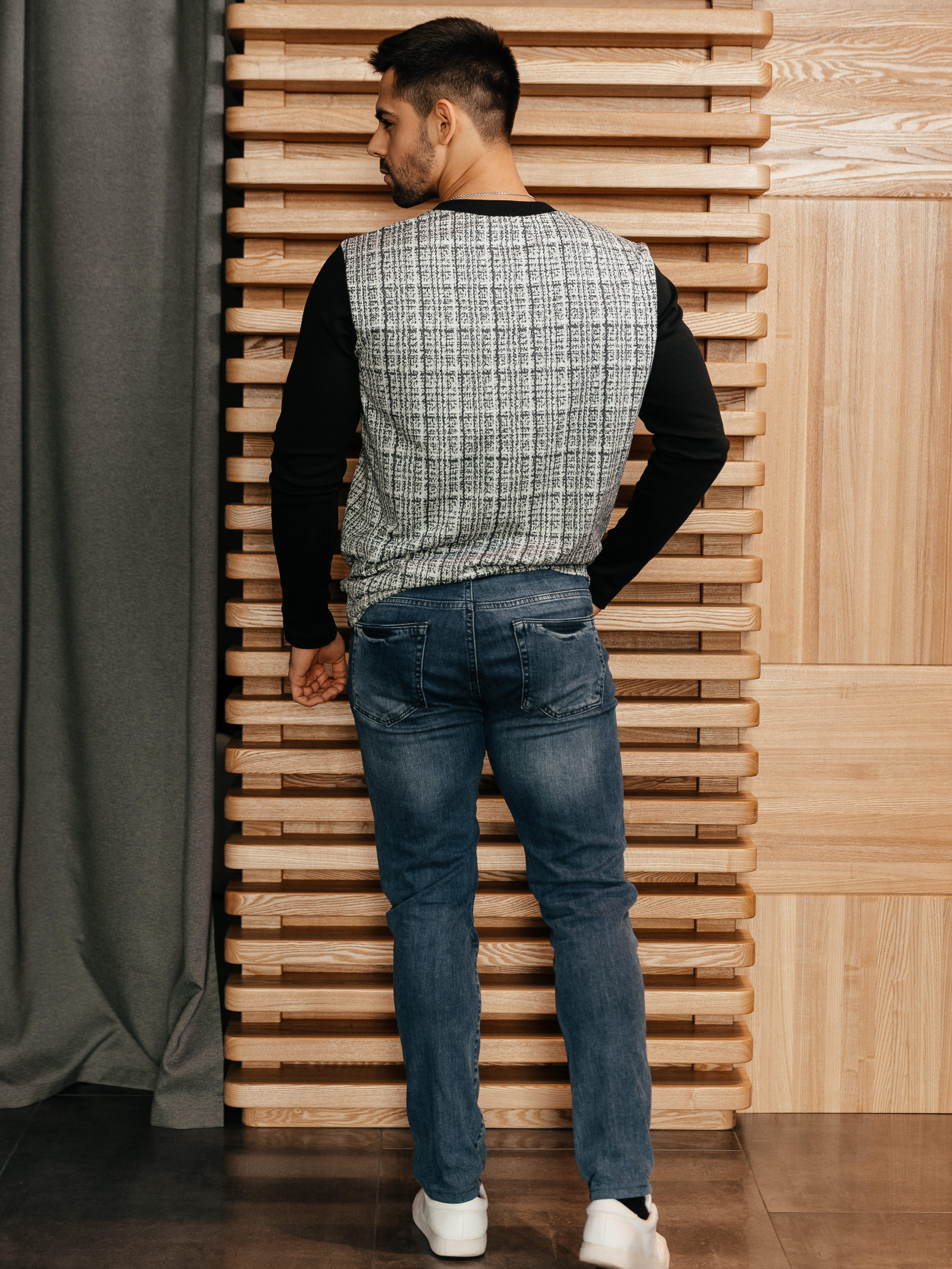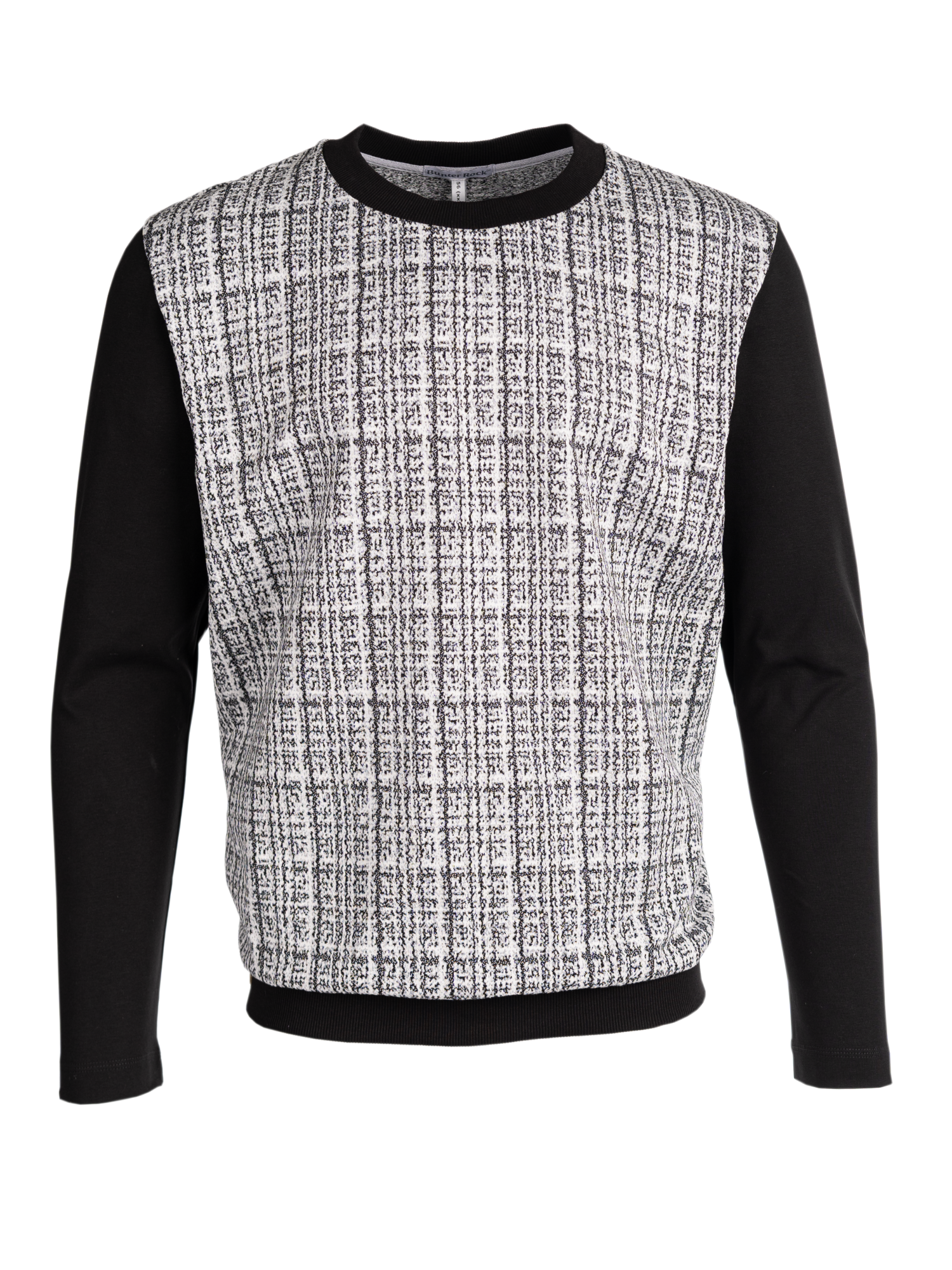 Свитшот из средней плотности трикотажа с принтом гленчек по спинке и полочке. Рукава однотонные рибана. Низ изделия оформлен планкой только спереди. Модель прилегающего силуэта. Ткань от итальянского производителя.