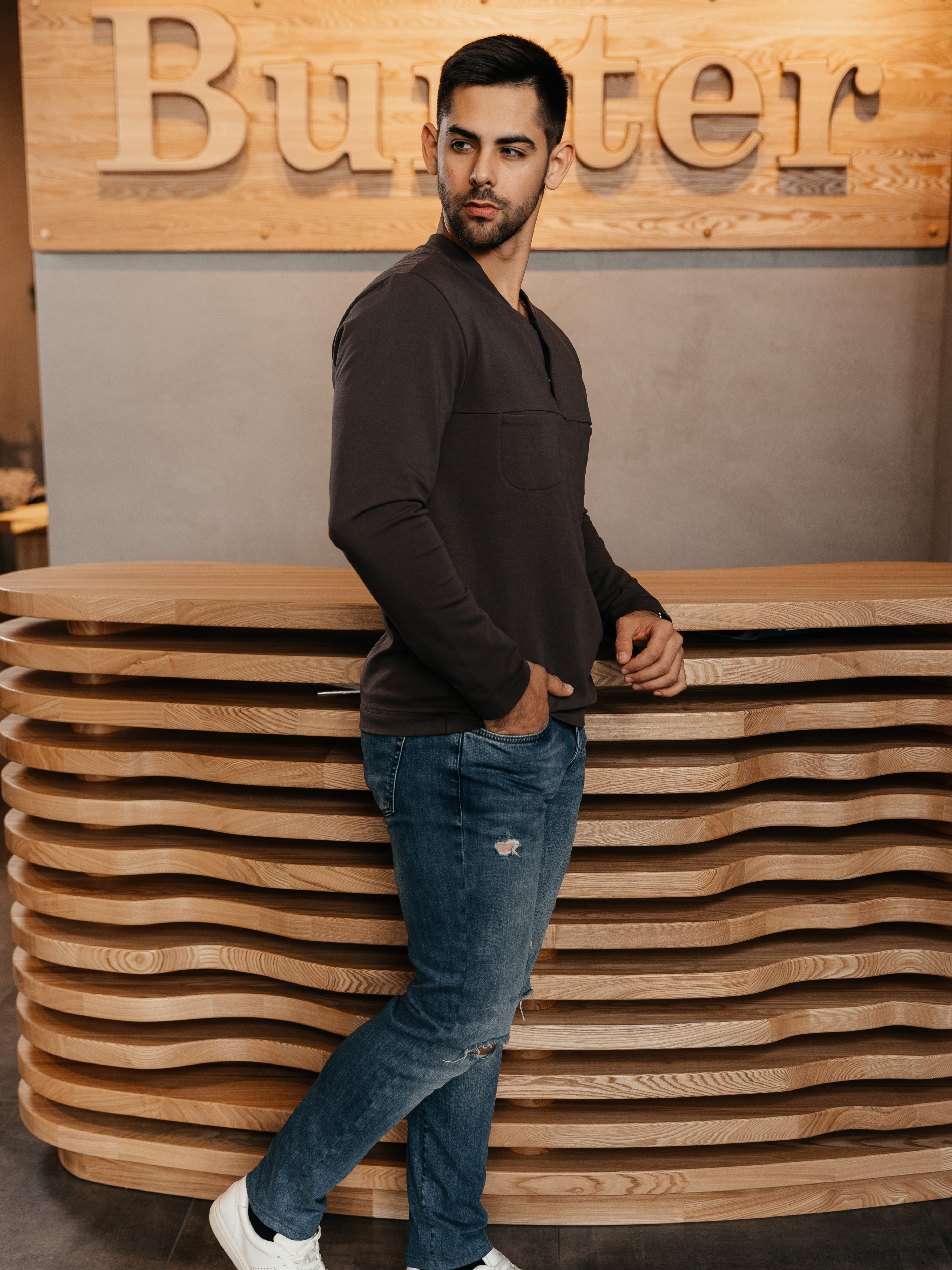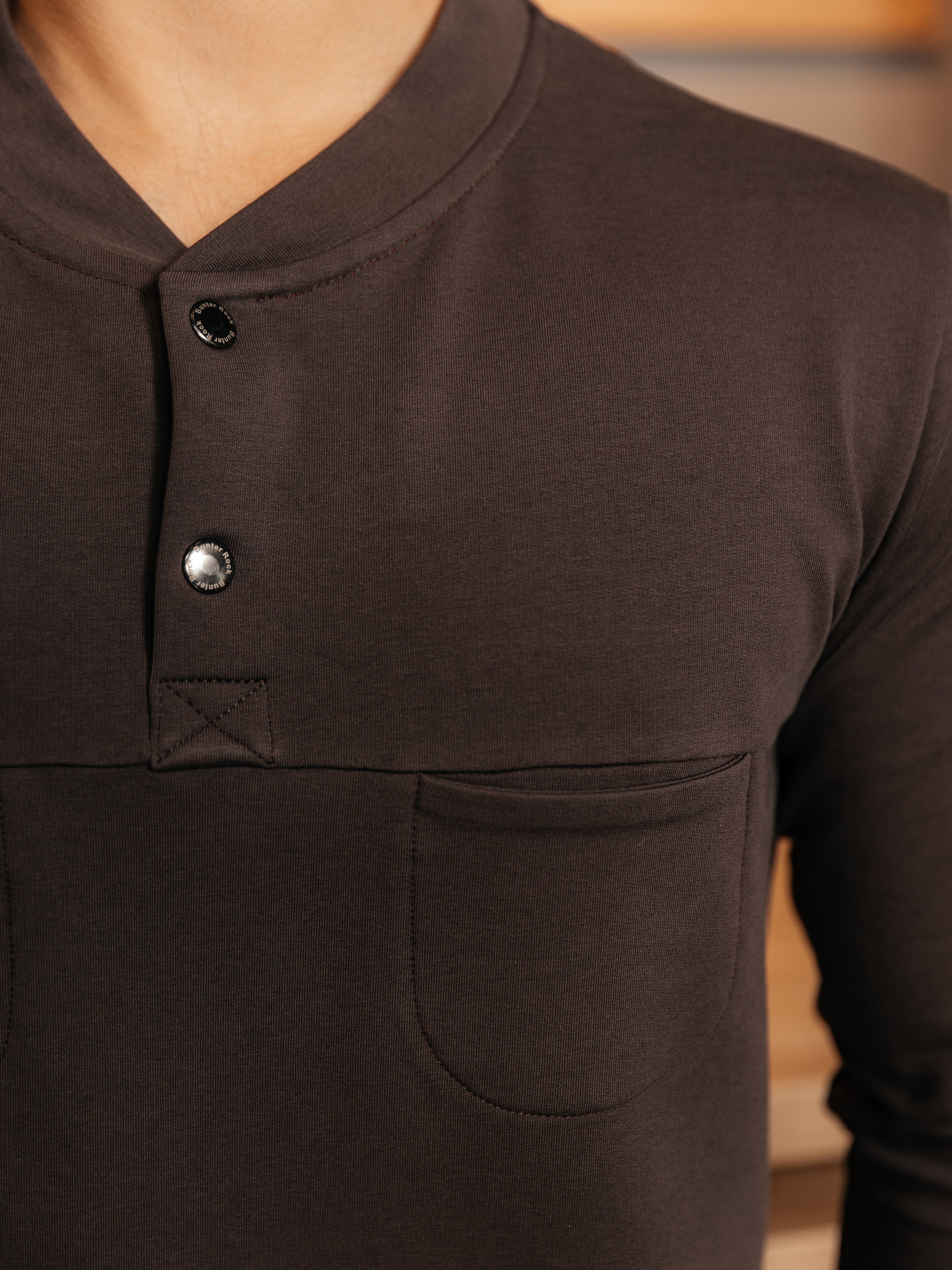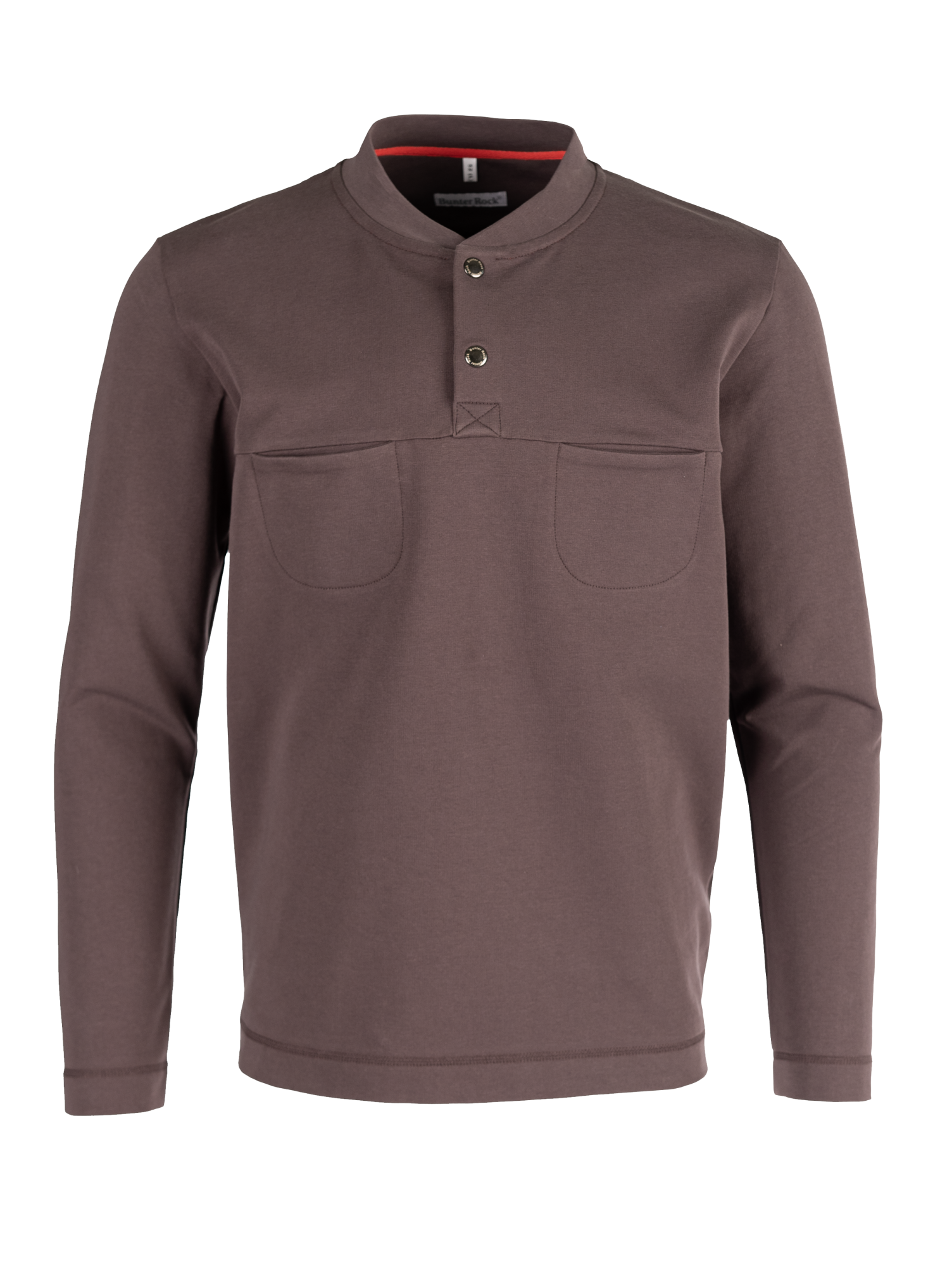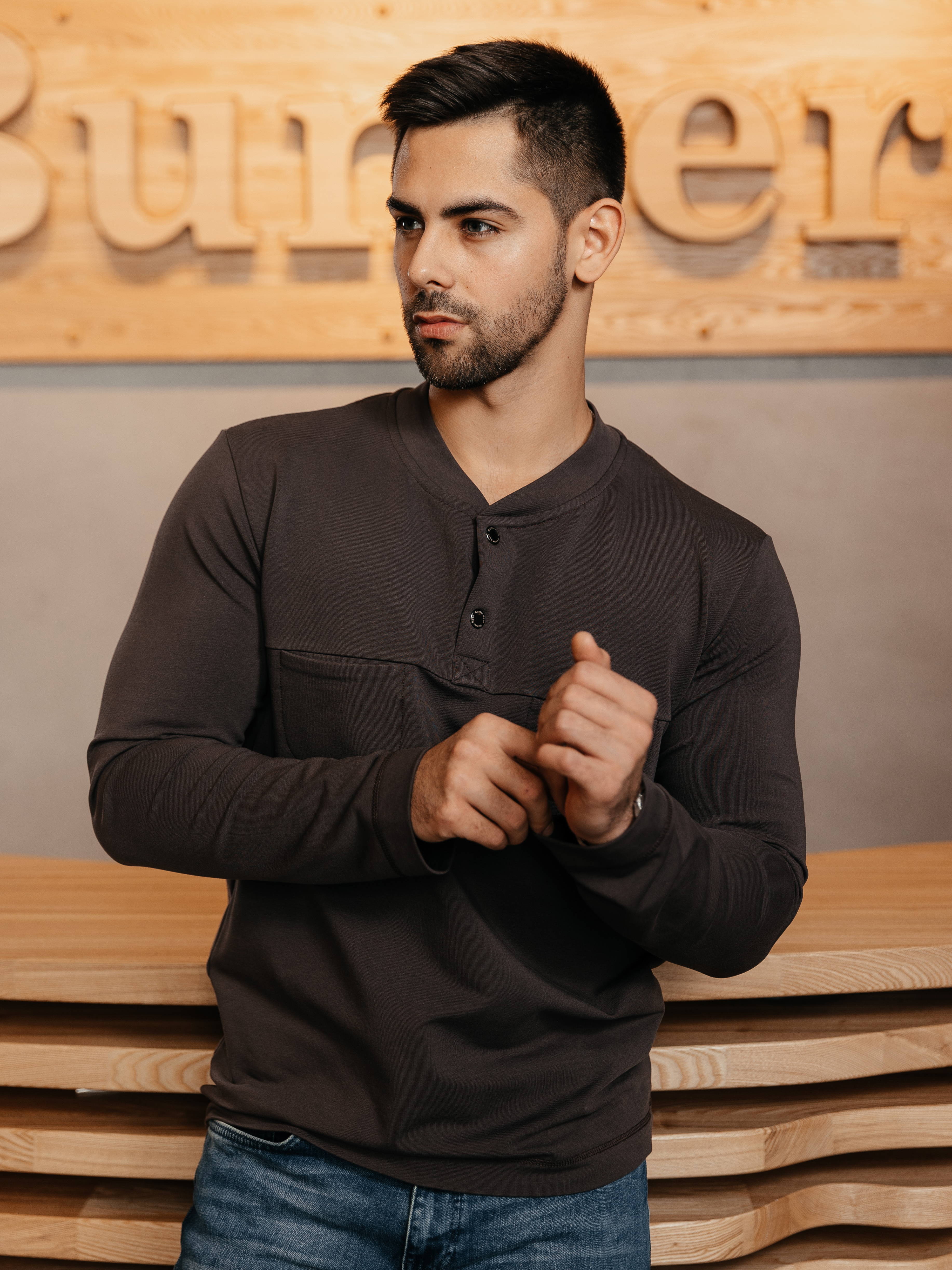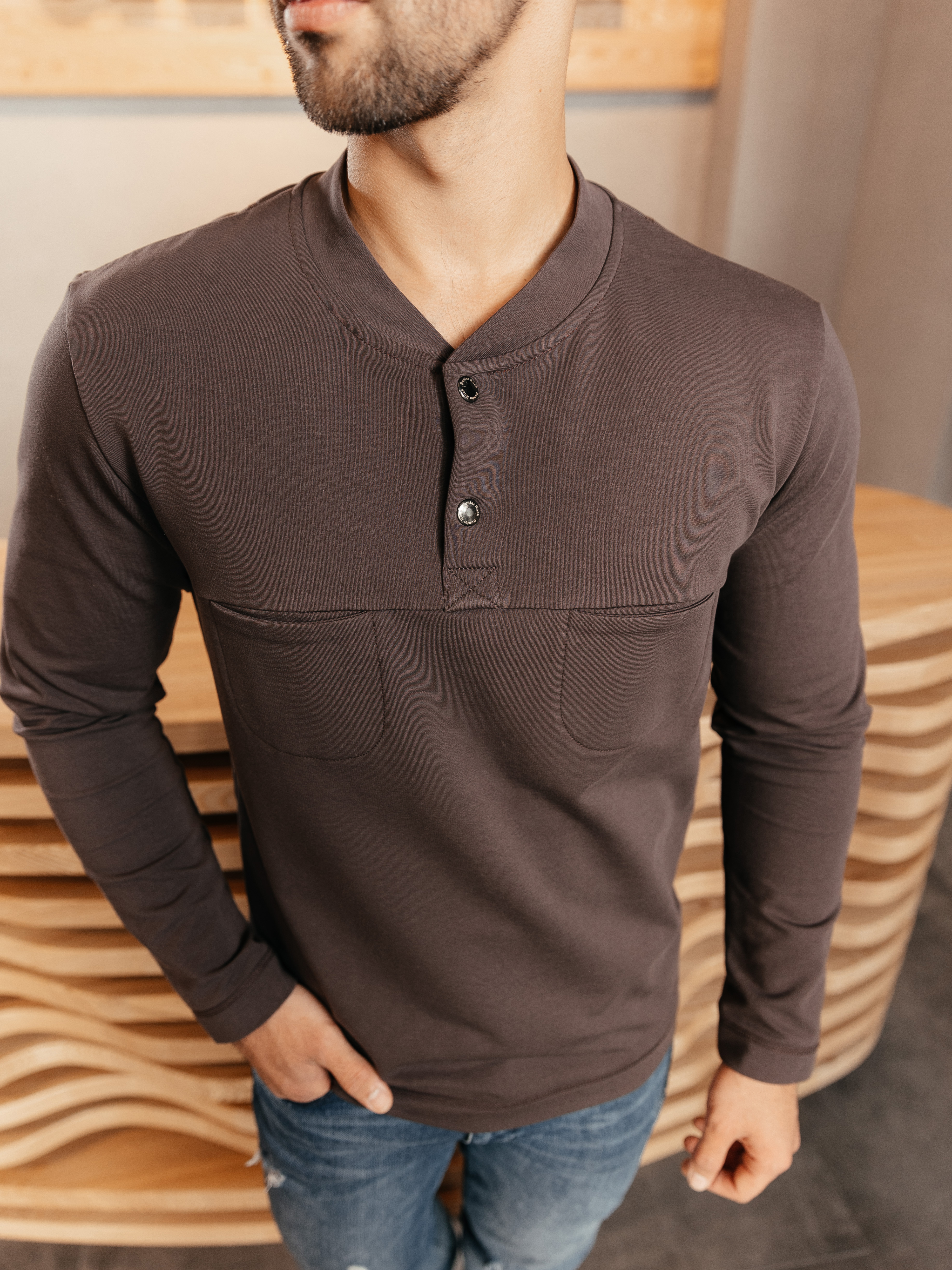 Свитшот полуприлегающего силуэта полноценной длины, застежка поло на кнопках, небольшие кармашки на груди. Цвет — мокко. Карманы на полочке выглядят оригинально и задают молодежный тон.