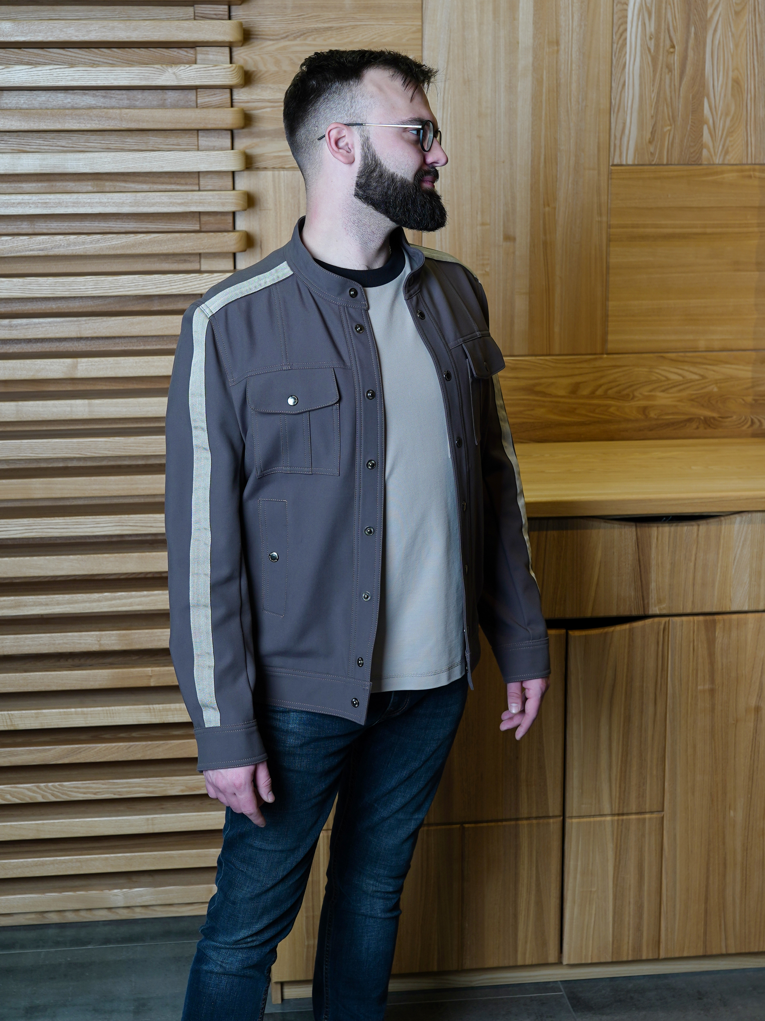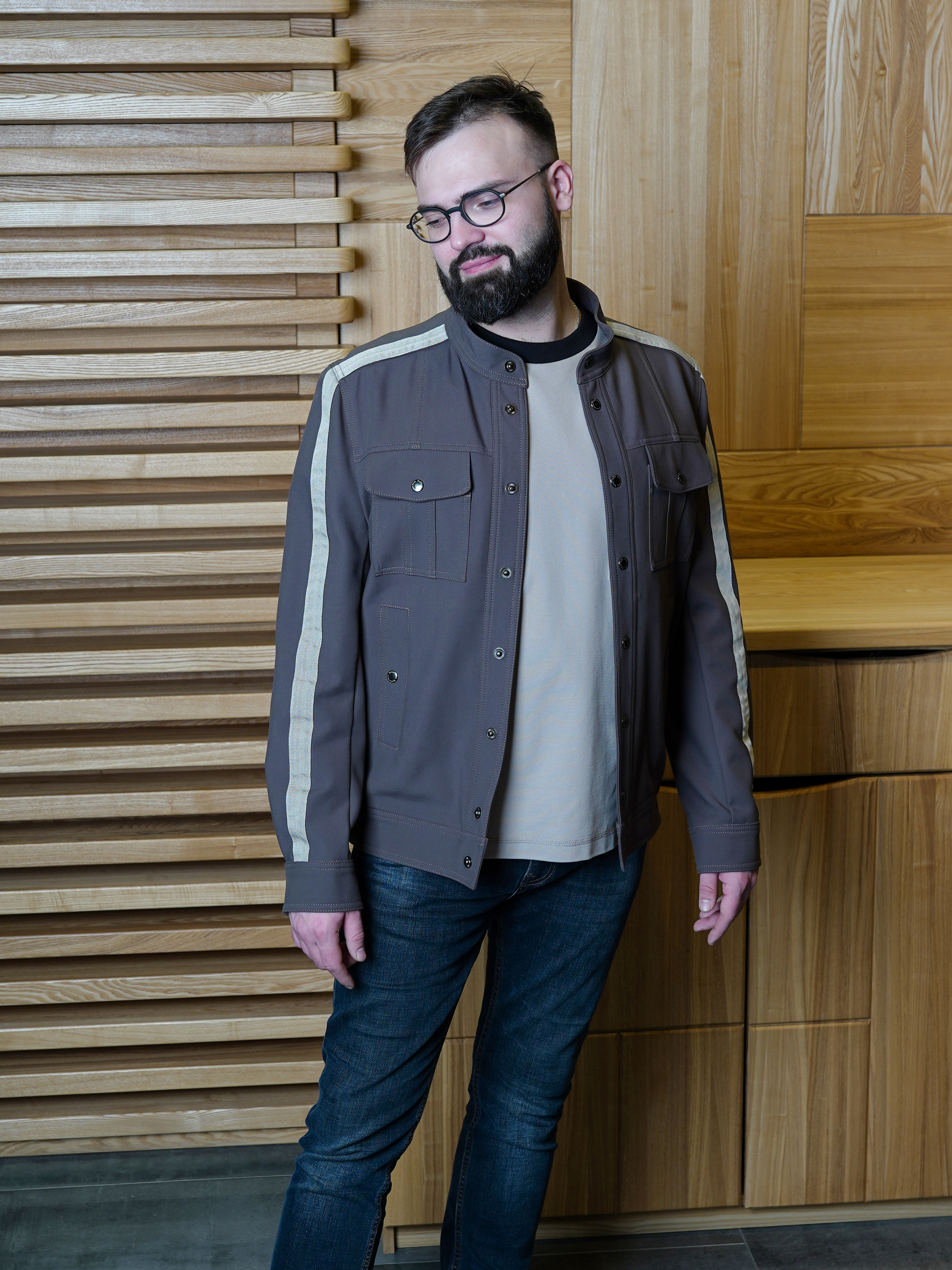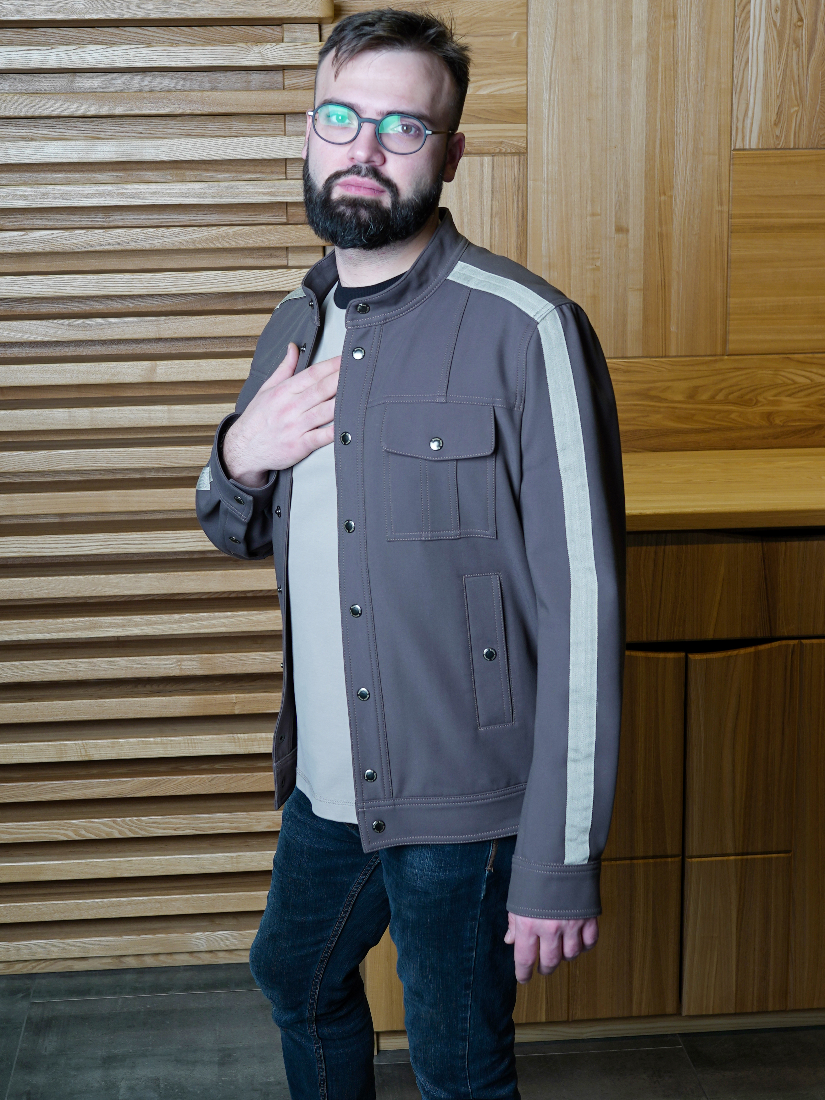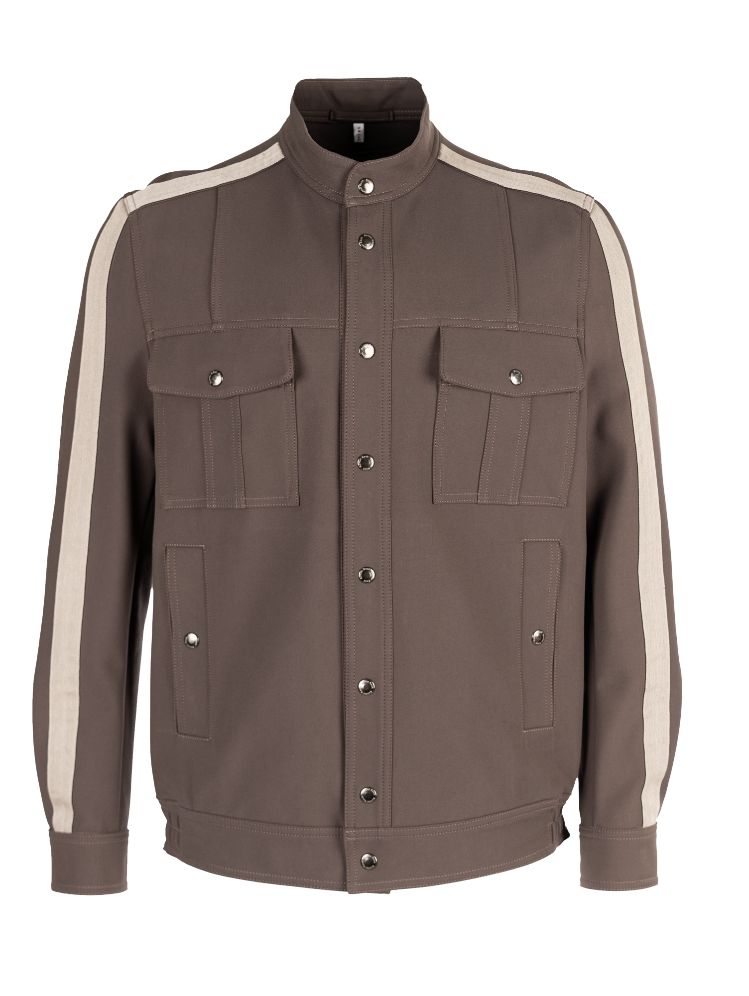 Куртка из хлопка итальянского производителя пепельно-коричневого цвета с лампасами бежевого-серого цвета. Без подкладки. Воротник стойка. Два нагрудных кармана с клапанами, два боковых и два внутренних. Силуэт полуприлегающий. Подойдет для носки от +15.