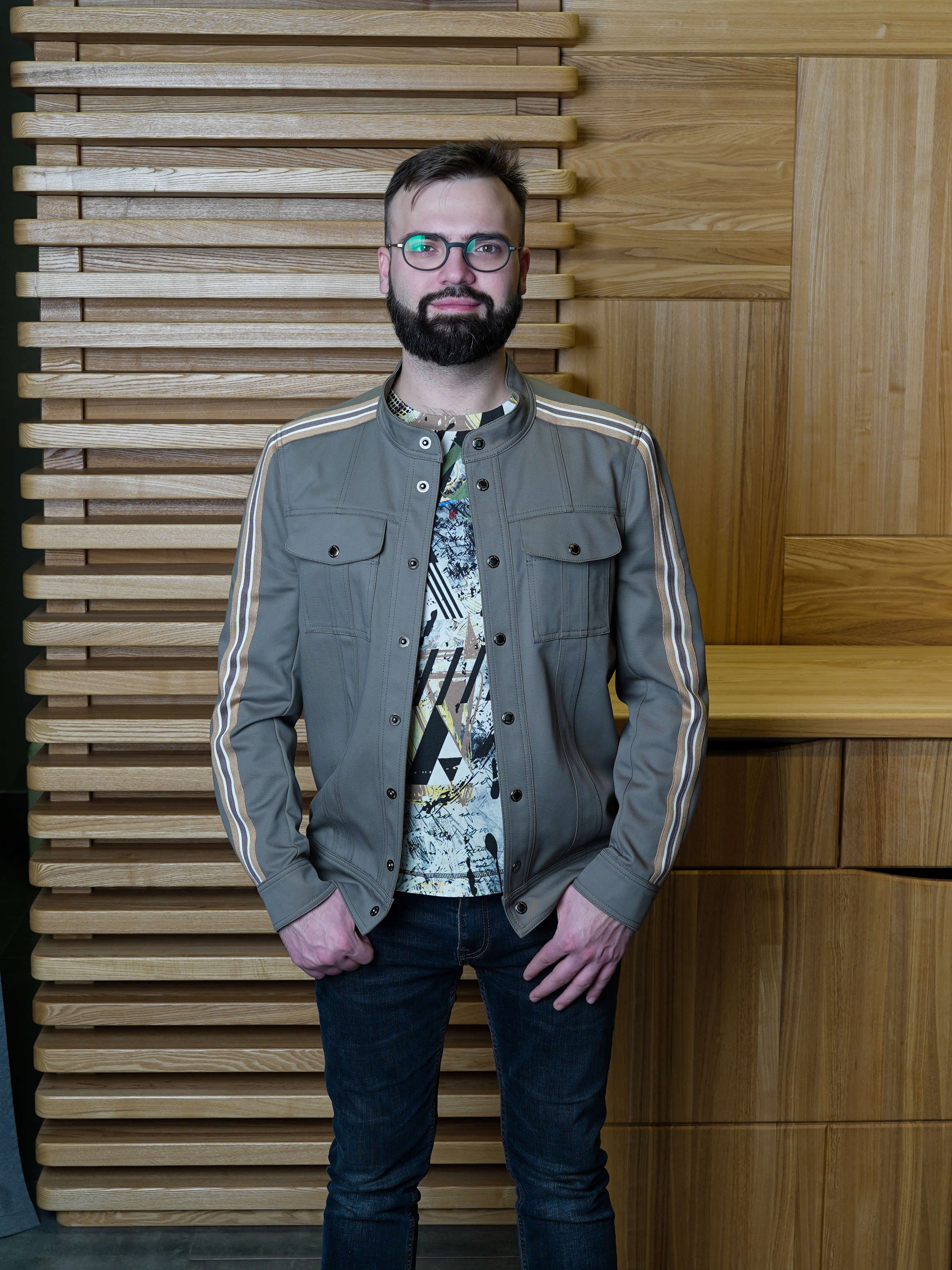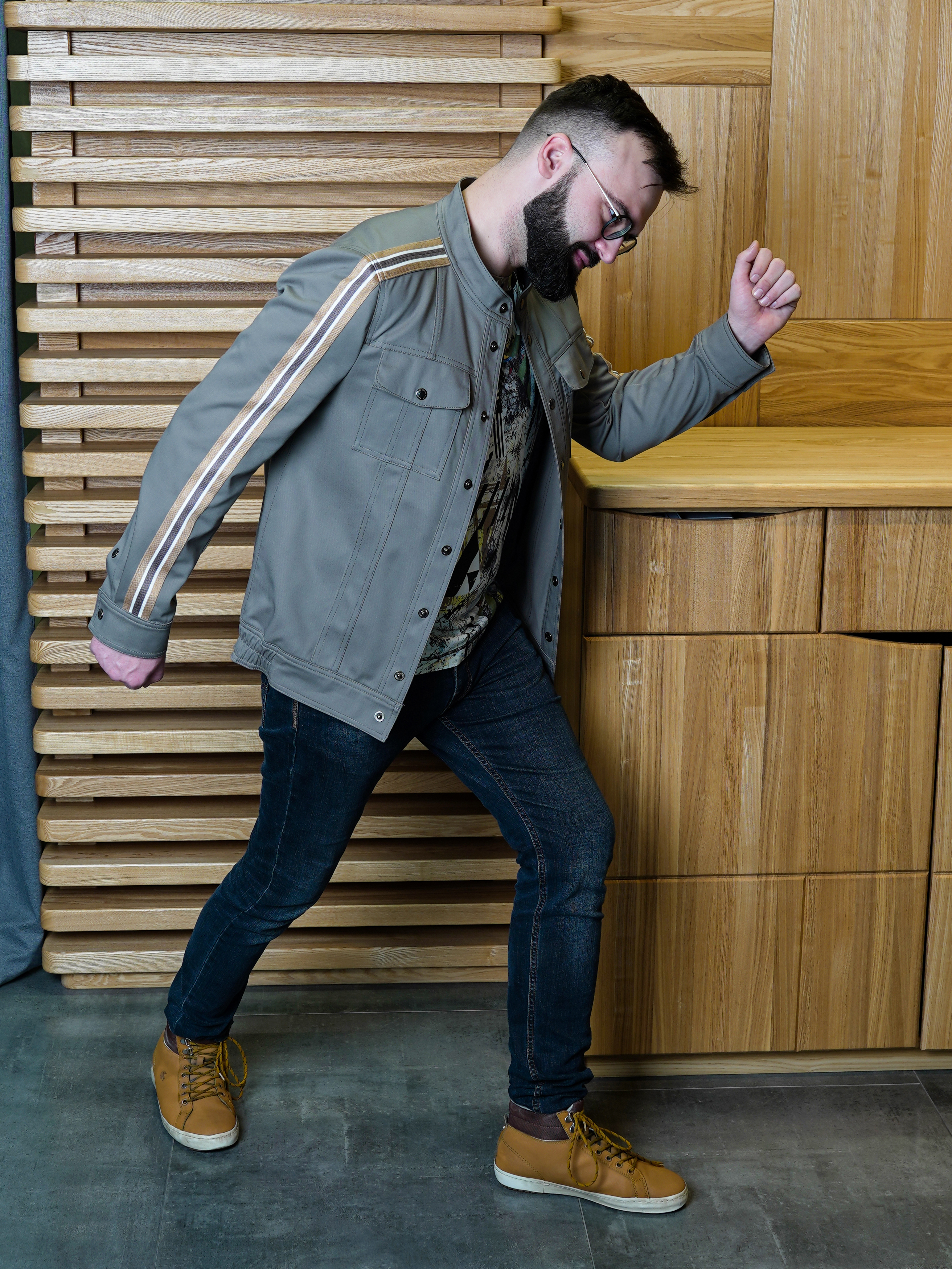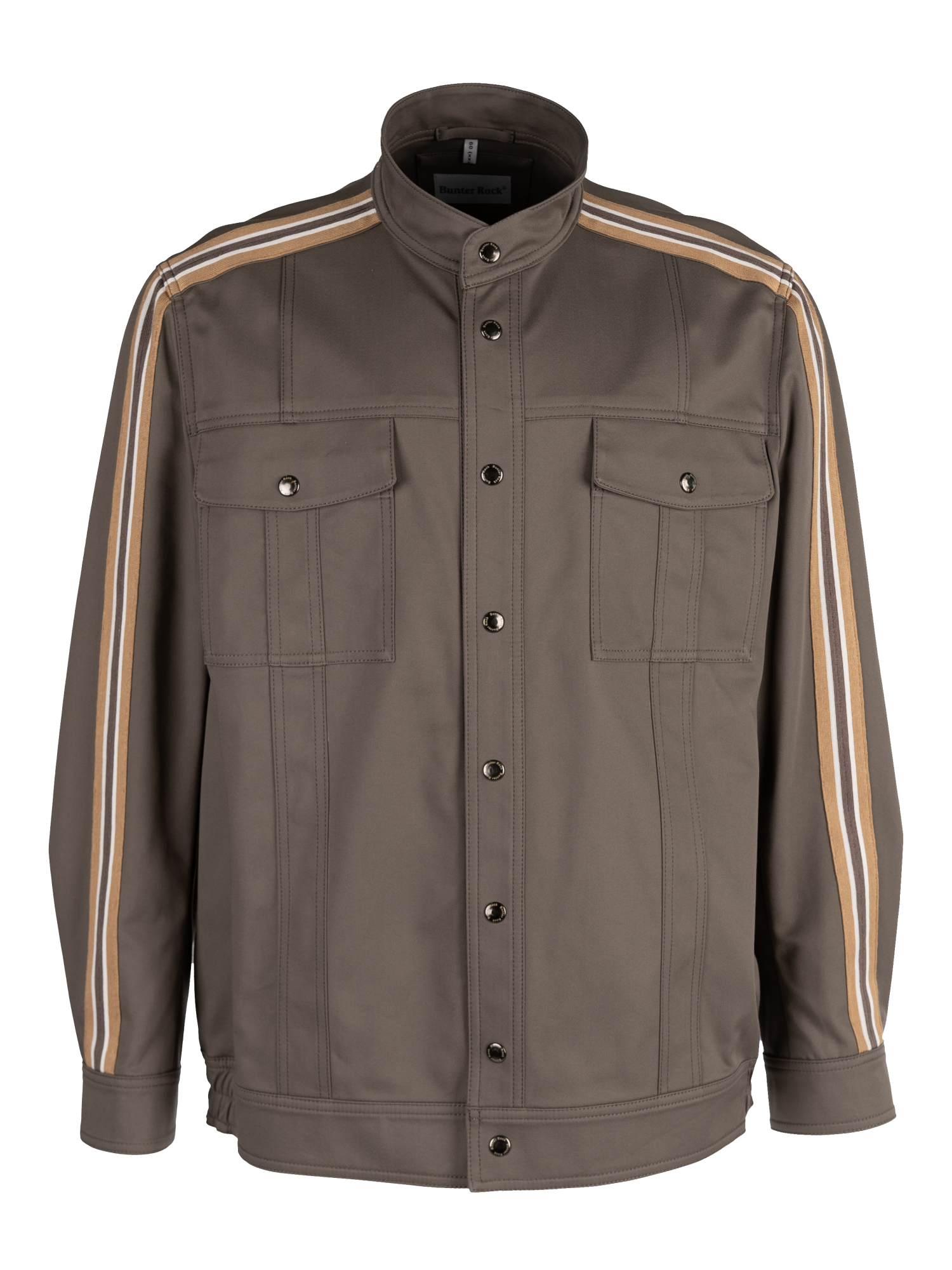 Куртка из хлопка итальянского производителя без подкладки. Воротник стойка, застежка — металлические кнопки. Рукав отдекорирован лампасами в бело-коричневых оттенках. Два нагрудных кармана. Цвет — светлый серовато-оливковый. Силуэт полуприлегающий. Подойдет для носки от +15.