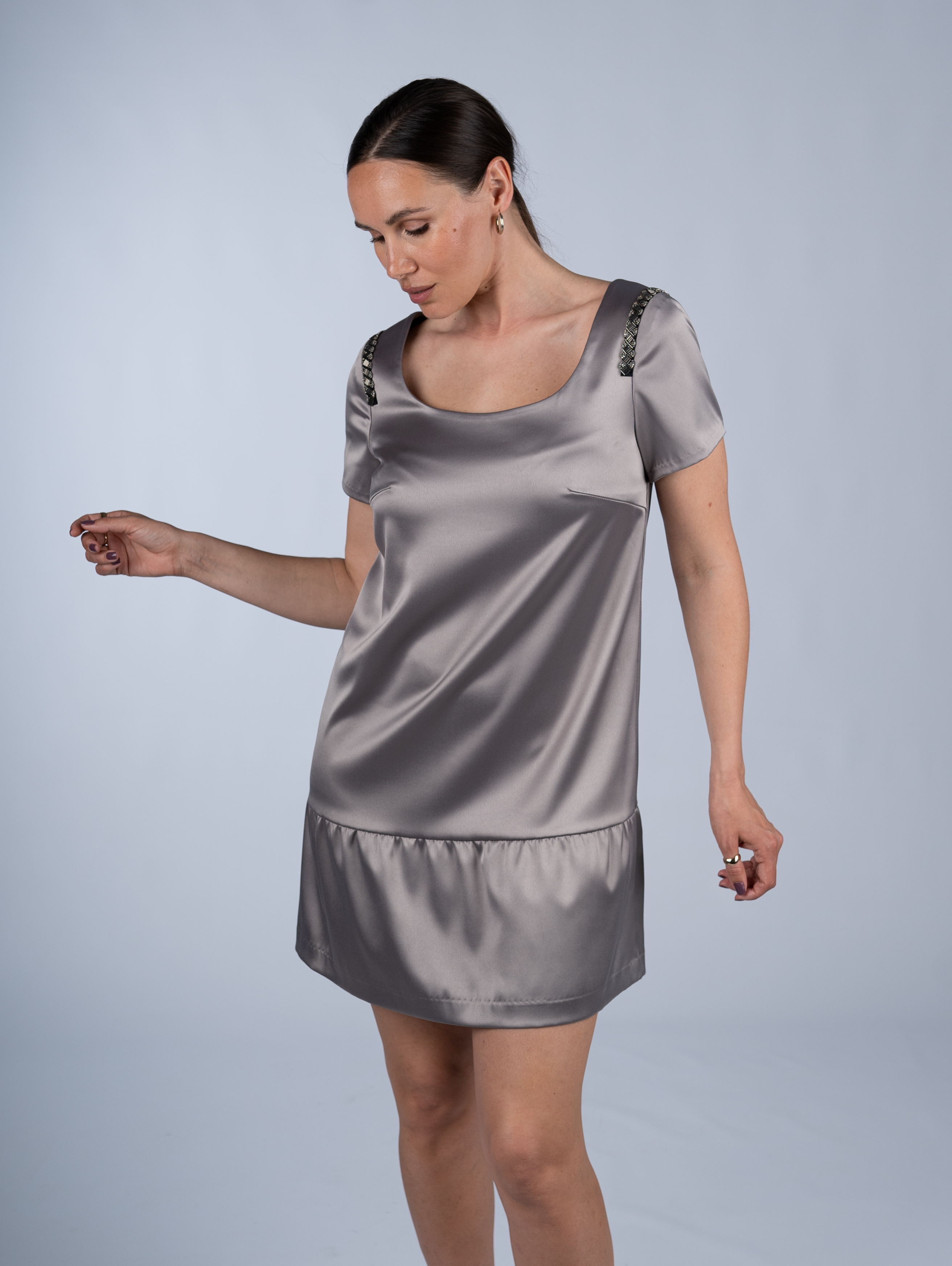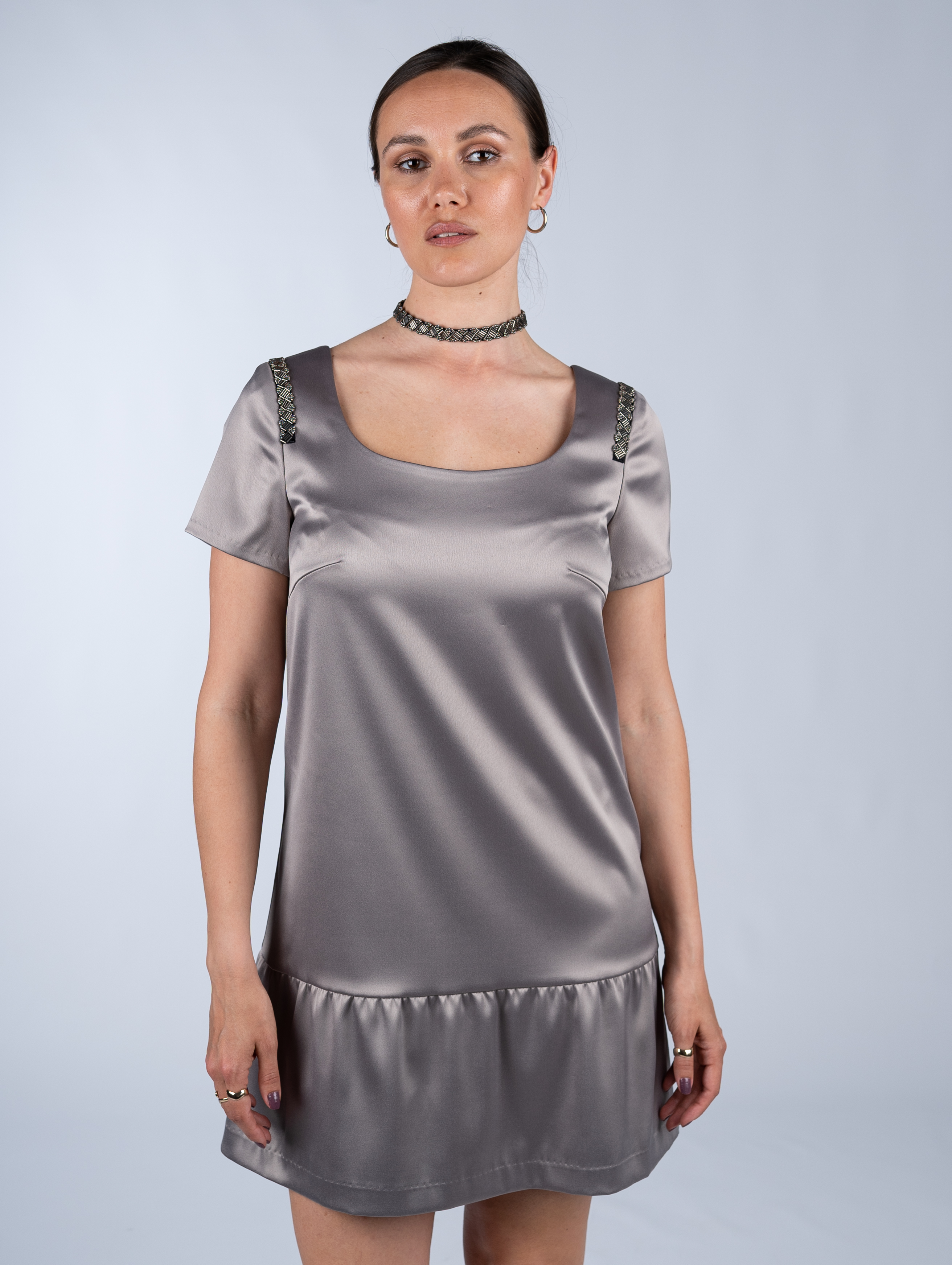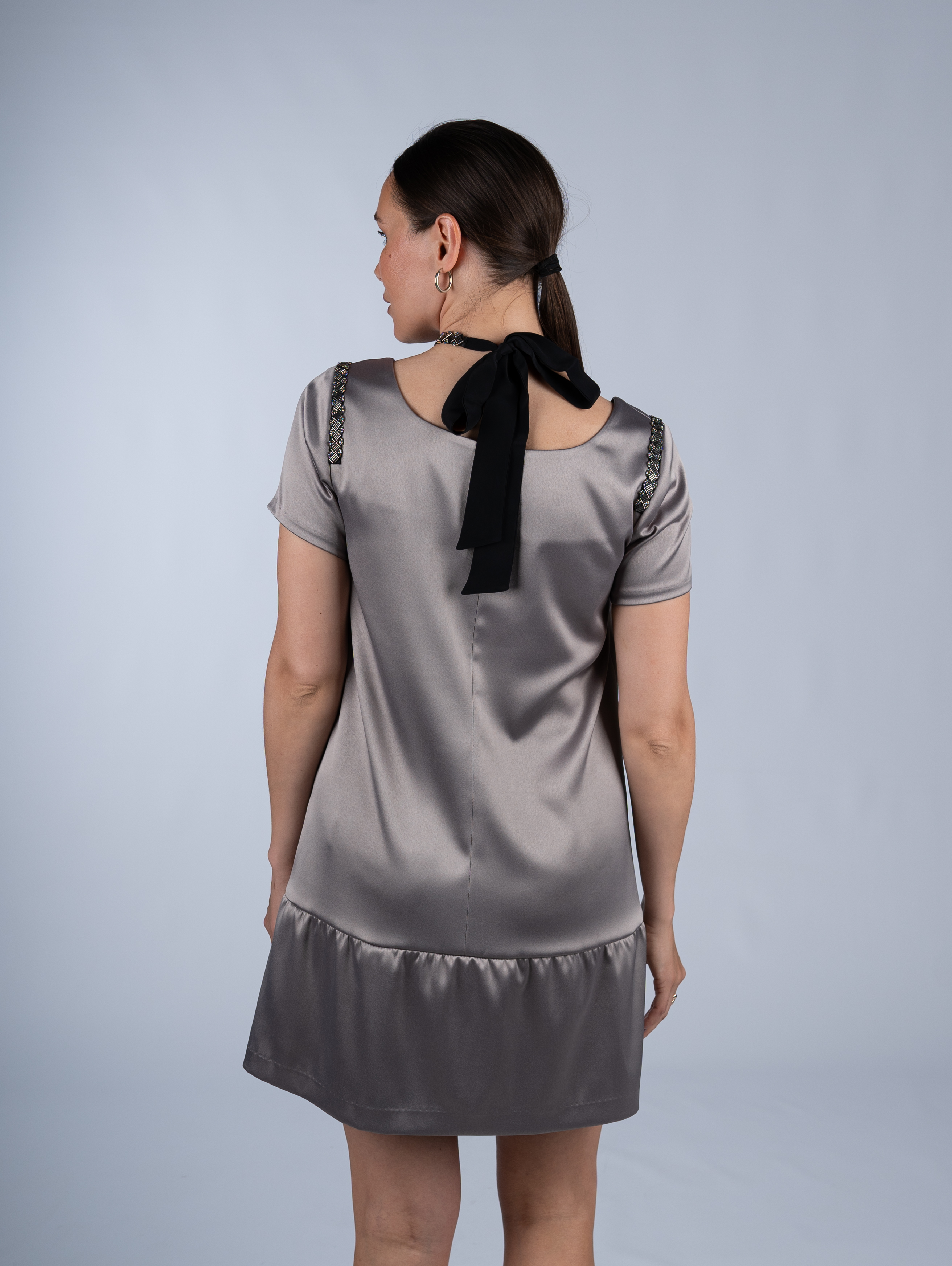 Глубокий вырез горловины спереди и сзади. Трапеция. Длина выше колена. Оборка по низу платья. На плечах украшение с бисером. Платье дополнено чокером на завязке/лентой из крепдешина черного цвета с серебристым бисером по центру (длина 150см, с бисером 27см)